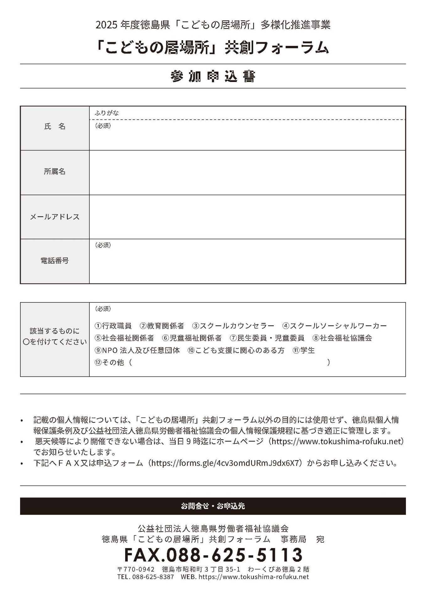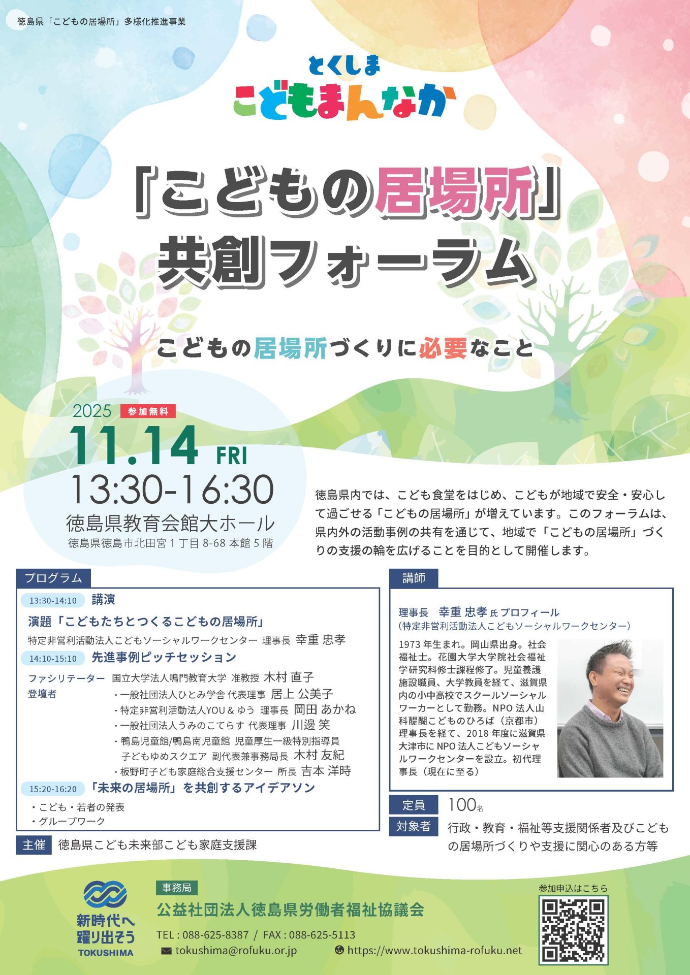 「こどもの居場所」共創フォーラムの開催について 2025年10月3日 お知らせ イベント情報 by とくしま県民活動プラザ. 「こどもの居場所」共創フォーラム事務局まで、お申し込みください。 申し込みフォーム(https://forms.gle/4cv3omdURmJ9dx6X7)またはFAX(088-625-5113) チラシR7.11.14「こどもの居場所」共創フォーラム 前の記事 次の記事