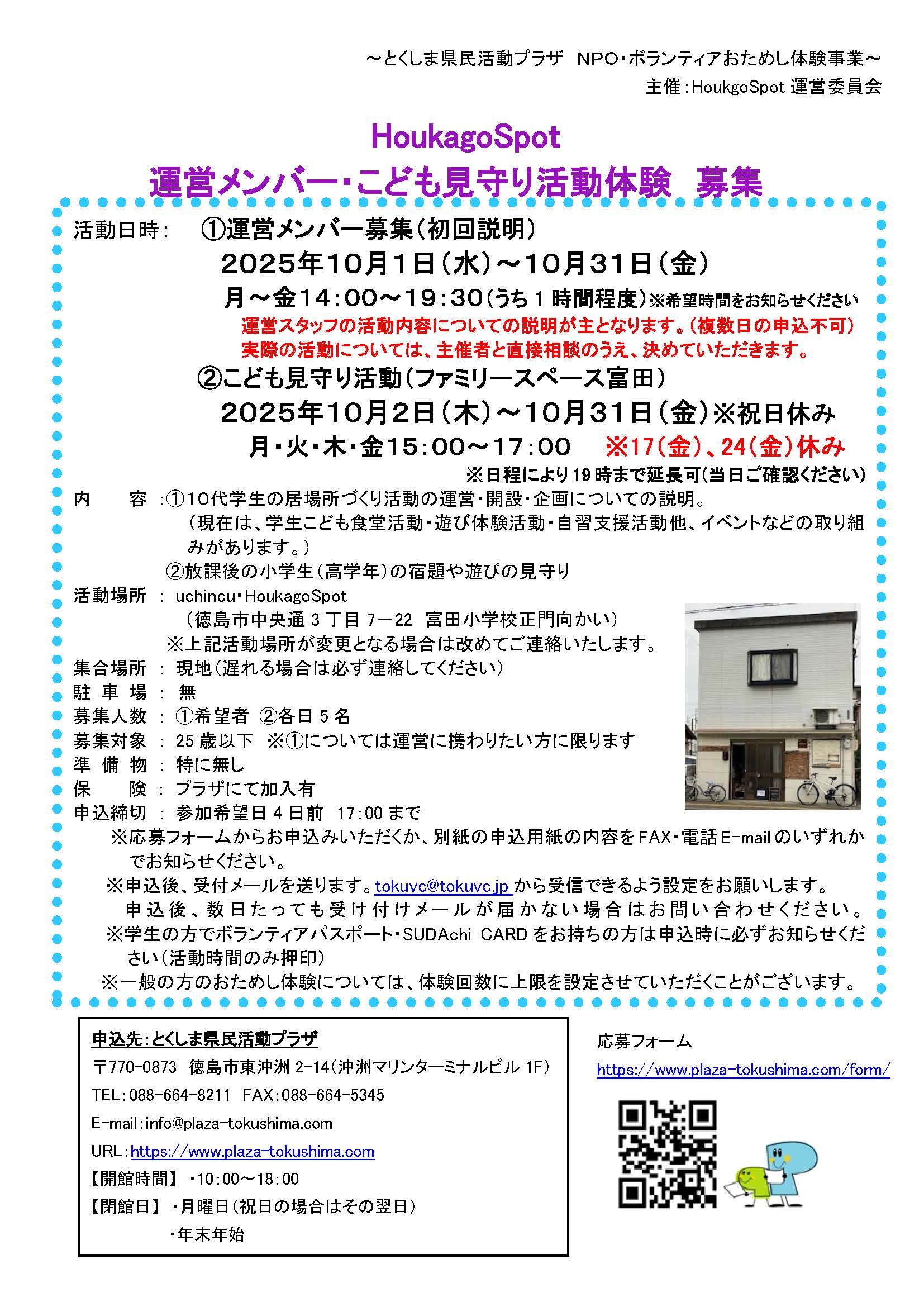 「HoukagoSpot運営メンバー・学生ボランティア体験)」ボランティアスタッフ募集(2025年10月) 2025年10月1日 お知らせ おためしボランティア情報 by plaza. こちらのフォームからお申し込みください。 ※必ずボランティアの名称を記入してください。 チラシHoukgoSpot 前の記事 次の記事