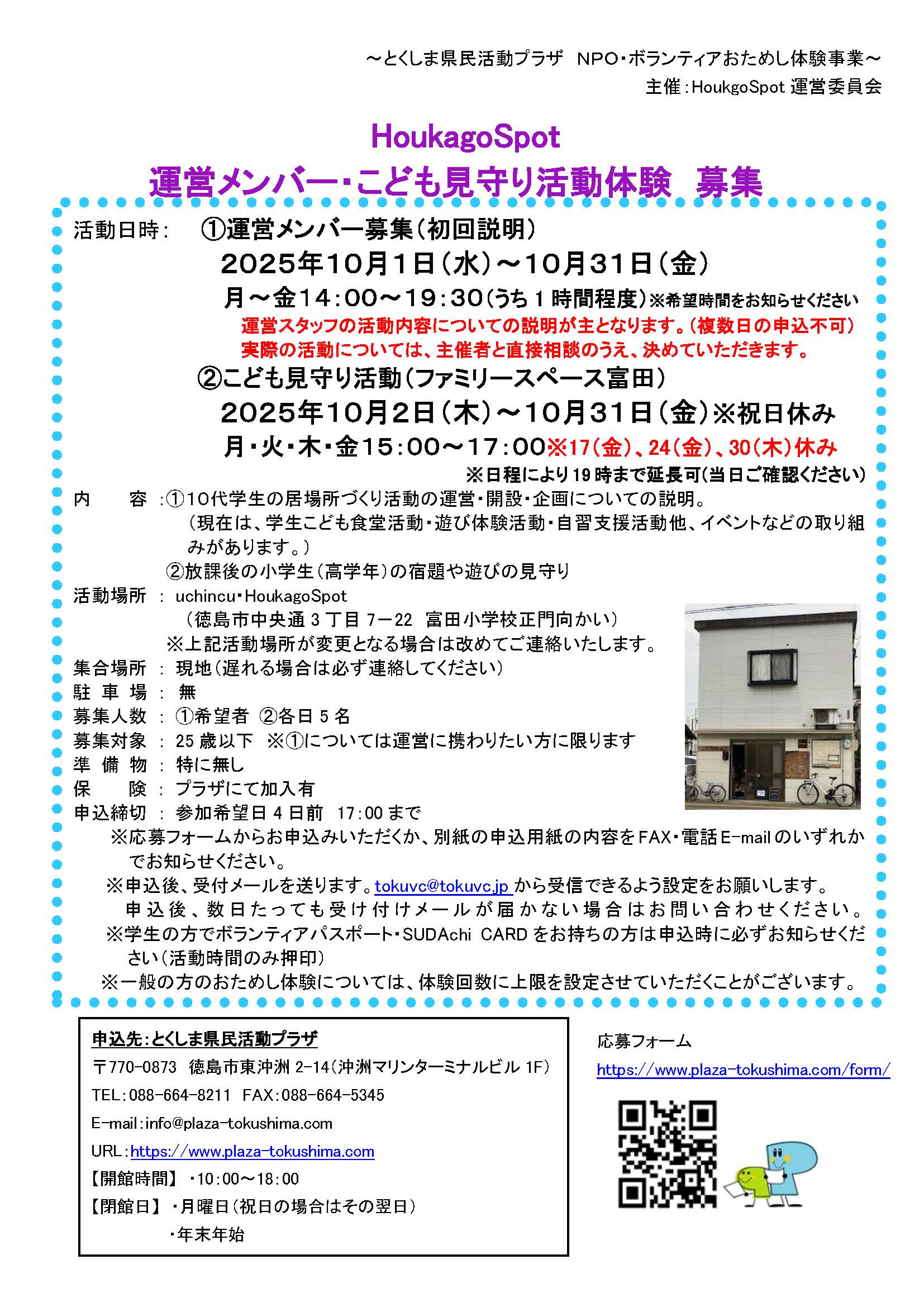「HoukagoSpot運営メンバー・学生ボランティア体験)」ボランティアスタッフ募集(2025年10月) 2025年10月9日 お知らせ おためしボランティア情報 by plaza. こちらのフォームからお申し込みください。 ※必ずボランティアの名称を記入してください。 チラシHoukgoSpot 修正 前の記事 次の記事