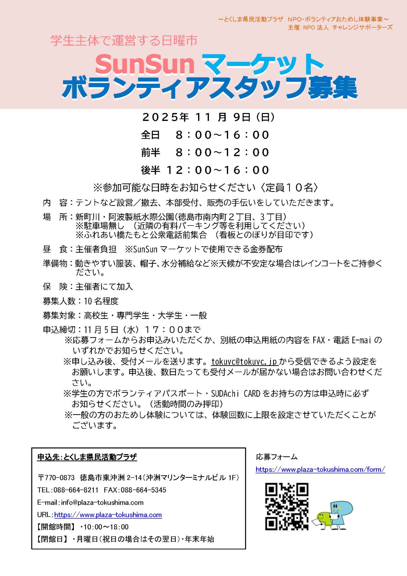 「SunSunマーケット」ボランティアスタッフ募集(2025年11月9日(日)) 2025年10月8日 お知らせ おためしボランティア情報 by plaza. ナイトSunSunマーケット こちらのフォームからお申し込みください。 ※必ずボランティアの名称を記入してください。 募集チラシ=SunSunマーケット 前の記事 次の記事