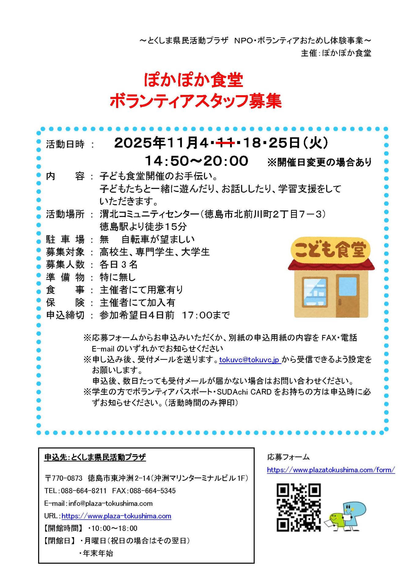 「ぽかぽか食堂」ボランティアスタッフ募集(2025年11月) 2025年10月15日 お知らせ おためしボランティア情報 by plaza. こちらのフォームからお申し込みください。 ※必ずボランティアの名称を記入してください。 チラシぽかぽか食堂 修正 前の記事 次の記事
