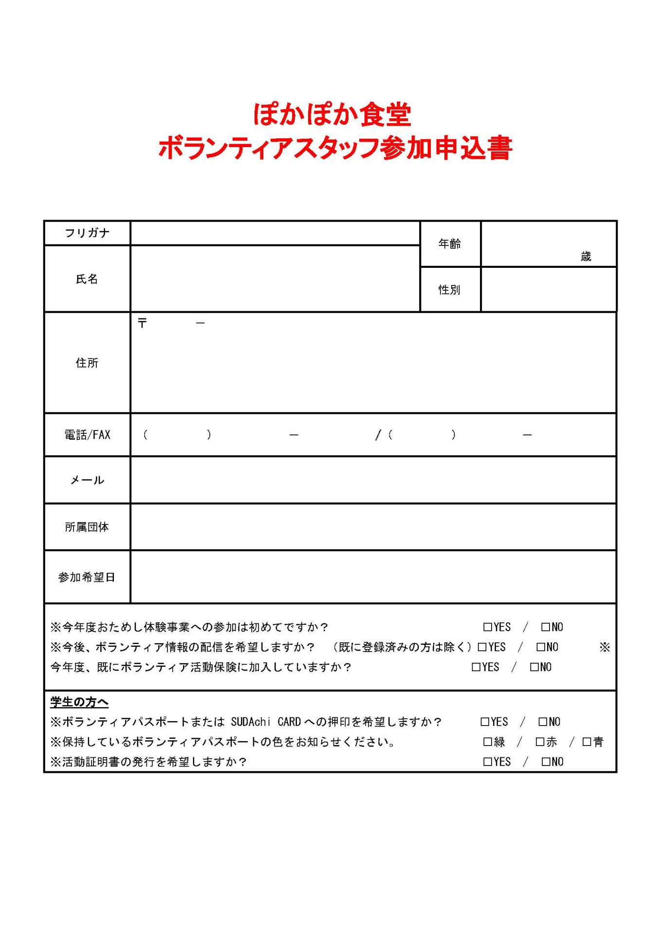 「ぽかぽか食堂」ボランティアスタッフ募集(2025年11月) 2025年10月8日 お知らせ おためしボランティア情報 by plaza. ぽかぽか食堂 こちらのフォームからお申し込みください。 ※必ずボランティアの名称を記入してください。 チラシぽかぽか食堂 前の記事