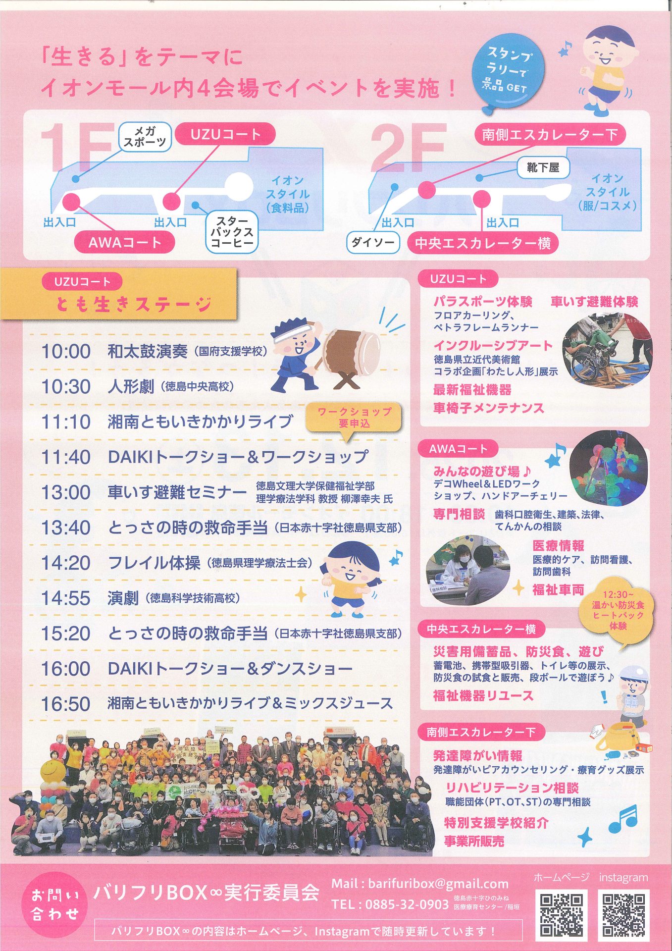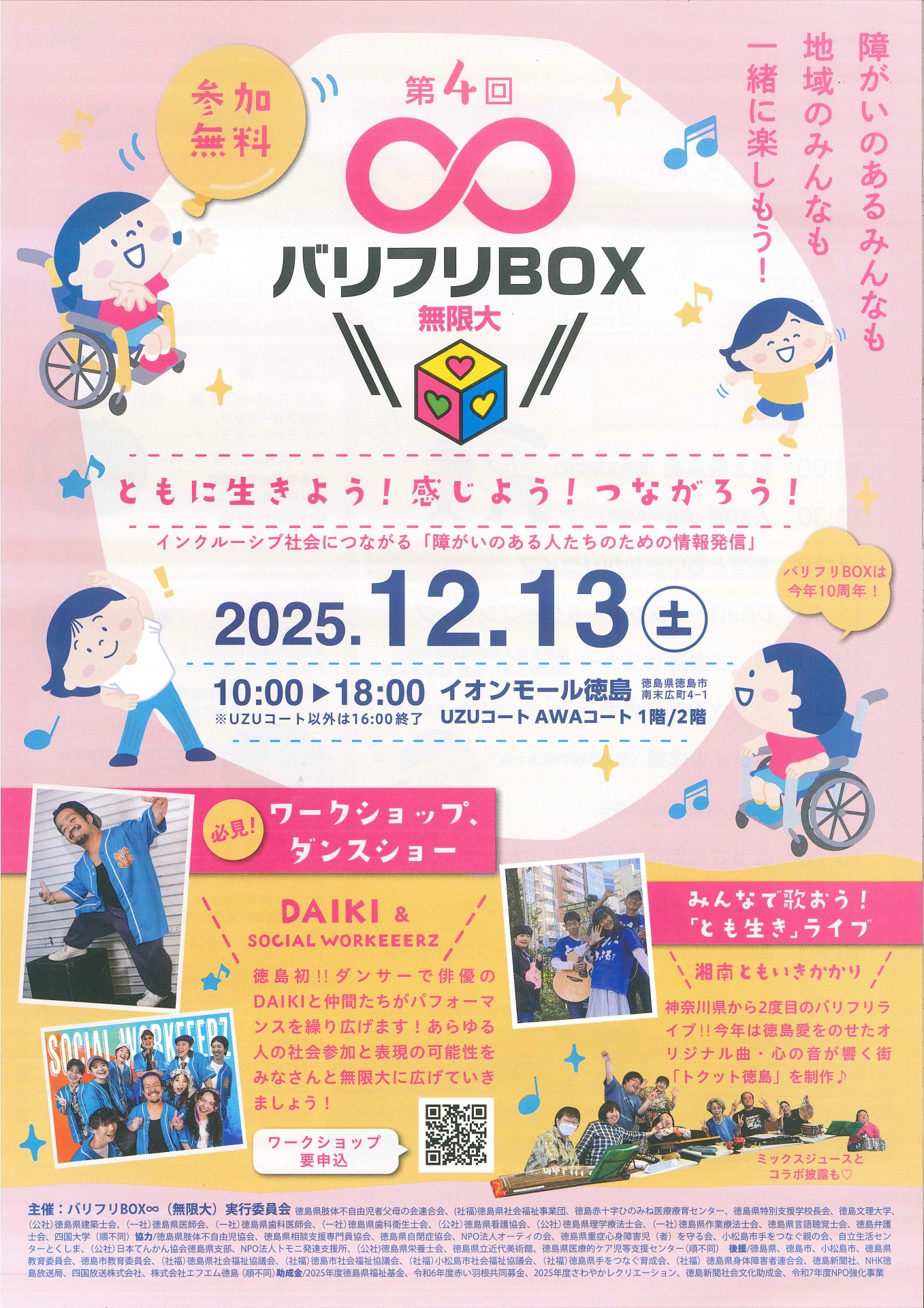 第4回バリフリBOX無限大の開催 2025年10月11日 お知らせ イベント情報 by とくしま県民活動プラザ. 詳細は「バリフリBOX無限大実行委員会」までお問い合わせください。 チラシpdf 前の記事 次の記事