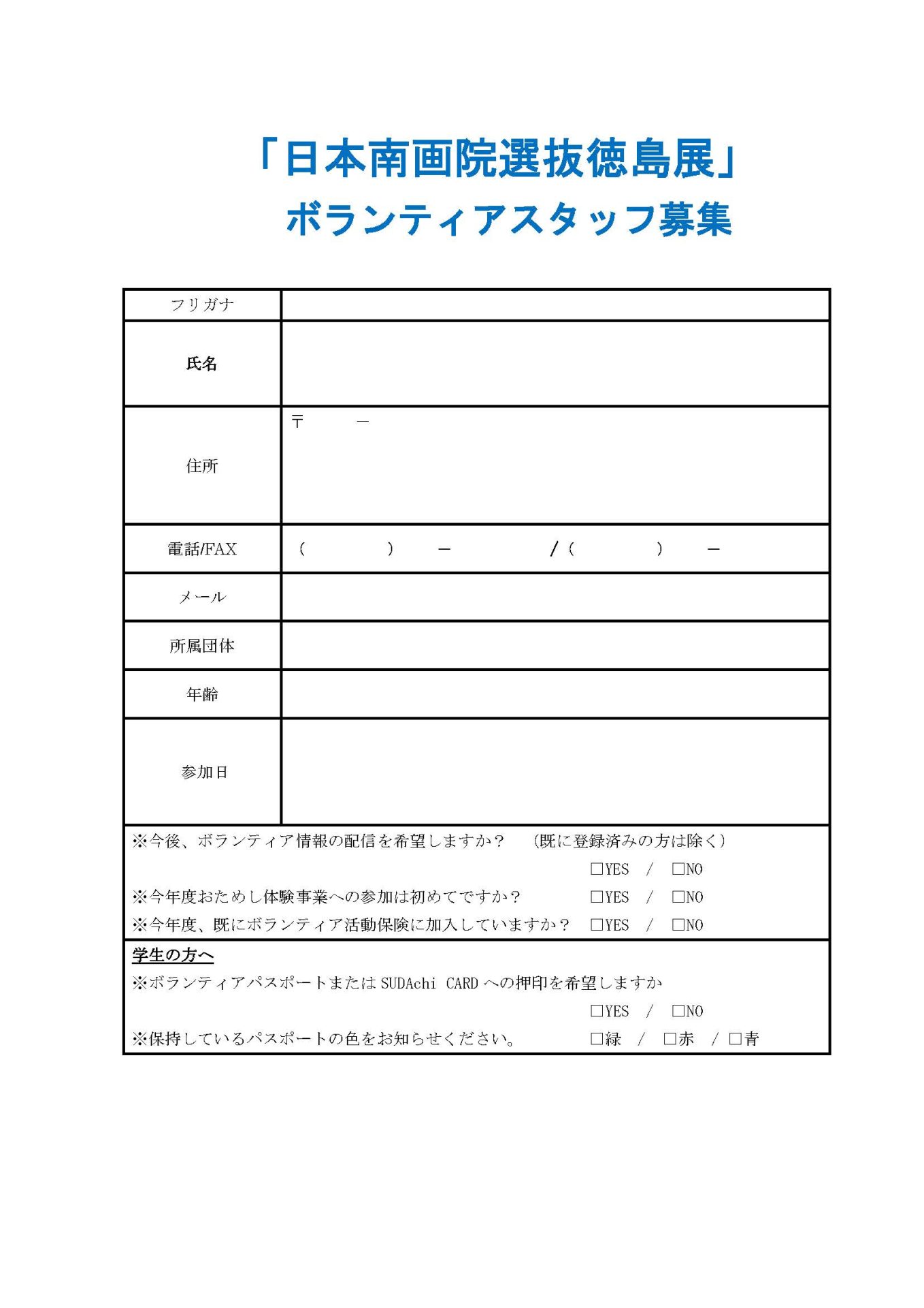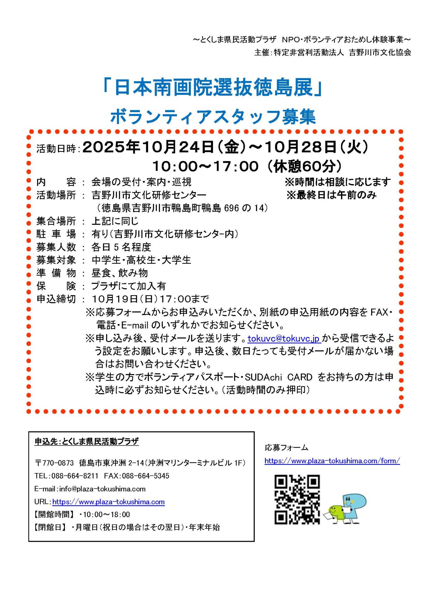 「日本南画院選抜徳島展」ボランティアスタッフ募集(2025年10月24日(金)~28日(火)) 2025年10月15日 お知らせ おためしボランティア情報 by plaza. こちらのフォームからお申し込みください。 ※必ずボランティアの名称を記入してください 募集チラシ=吉野川市文化協会日本南画院選抜修正 前の記事 次の記事