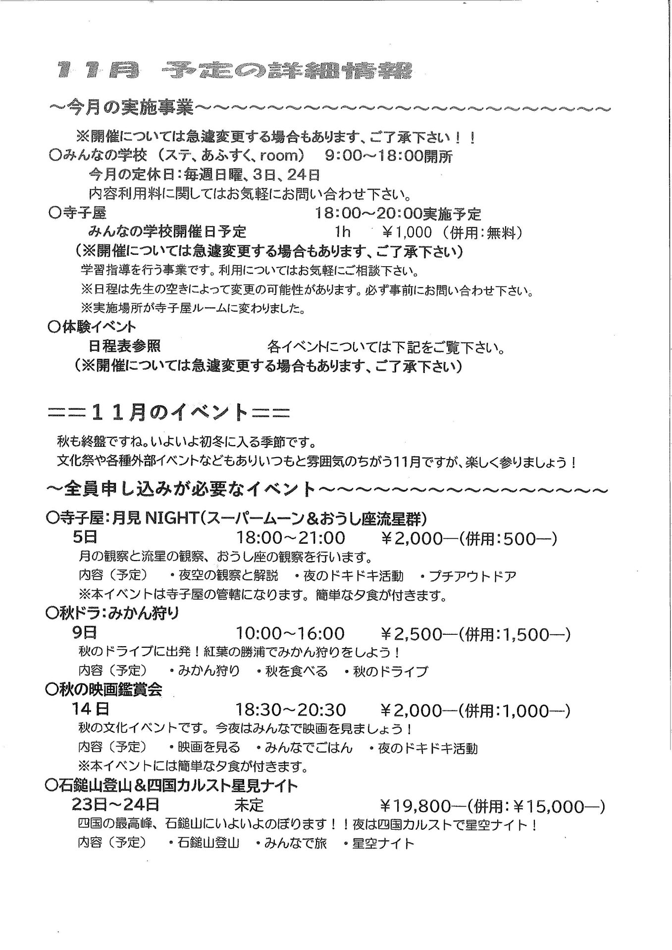 また、「午前のイベントだけ利用し、午後のイベントには参加しない」利用の場合は職員の配置が難しくなるため送迎をお受け出来ない場合があります。こちらもご承知おき頂き、ご相談頂くか「複数イベントのある日にフリースクール併用の場合、可能な限り当日全イベント参加」のご協力をよろしくお願い致します。