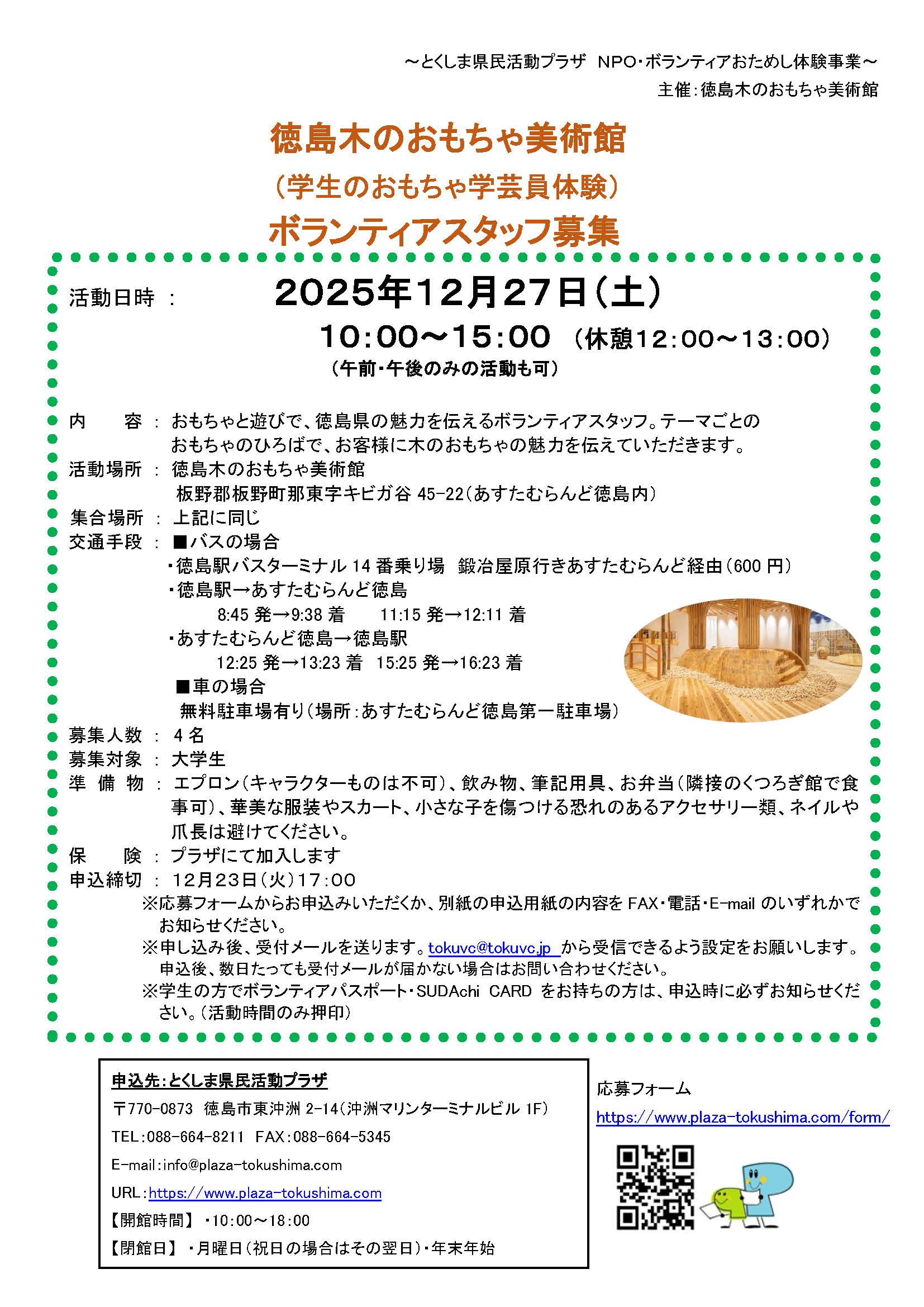 「徳島木のおもちゃ美術館(学生のおもちゃ学芸員体験)」ボランティアスタッフ募集(2025年12月27日(土)) 2025年11月2日 お知らせ おためしボランティア情報 by plaza. こちらのフォームからお申し込みください。 ※必ずボランティアの名称を記入してください。 募集チラシ=木のおもちゃ美術館 前の記事