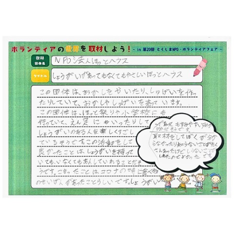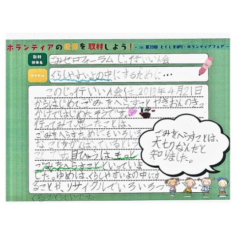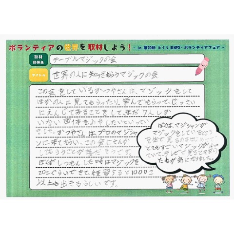 令和7年度 ボランティアの世界を取材しよう!(活動報告) 2025年11月20日 お知らせ イベント情報 プラザ事業 by plaza. 11月8日(土)とくしまNPO・ボランティアフェアの会場内で、2~6年生3名が参加し、取材のコツや記事の書き方、まとめ方を学んでいただきました。 ボランティア団体が活動を始めたきっかけや活動内容、今後の目標を知り、まとめシートを作成して発表しました。 子ども同士や子どもと大人が相互にコミュニケーションを図ることのできる機会となりました。 前の記事