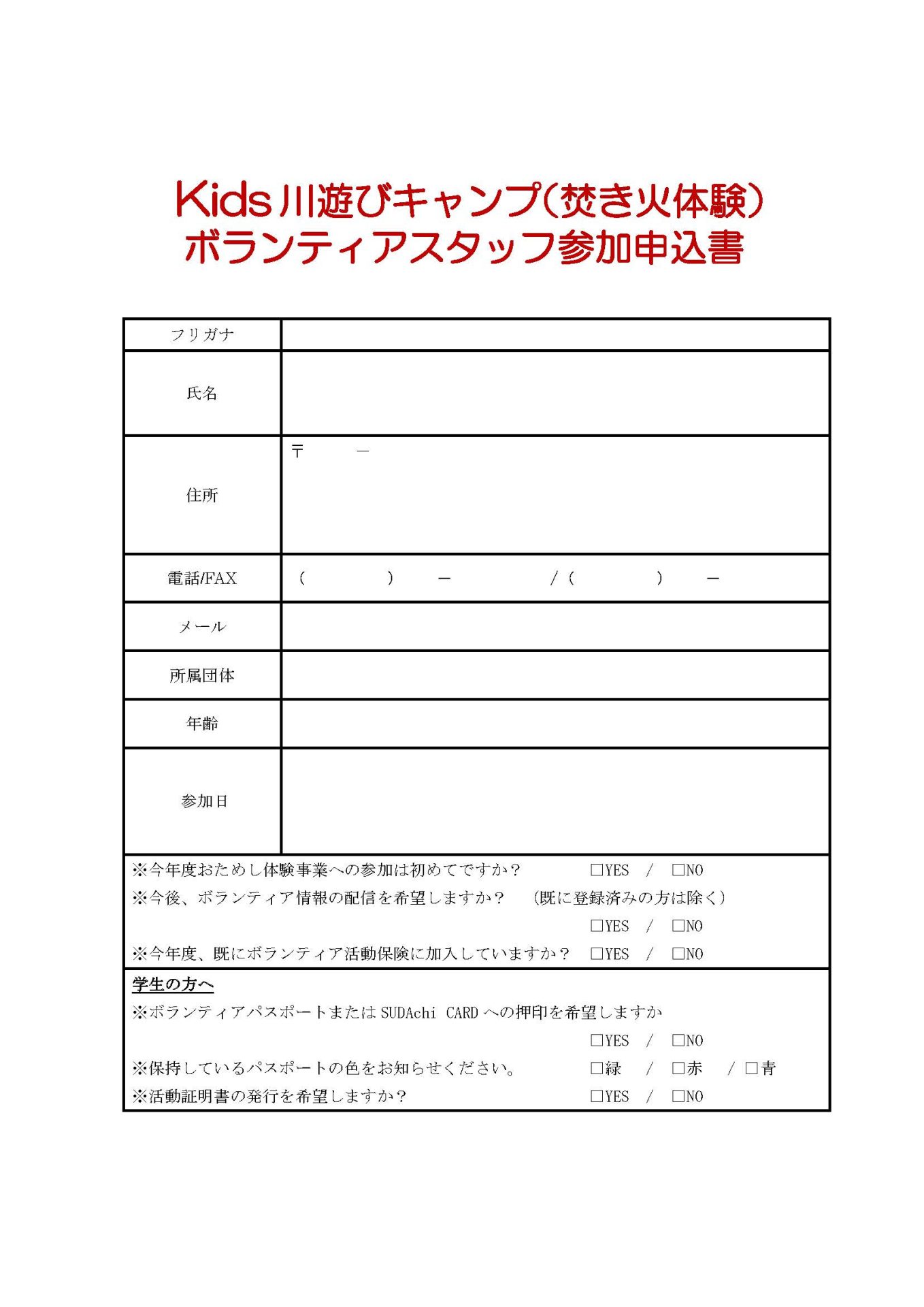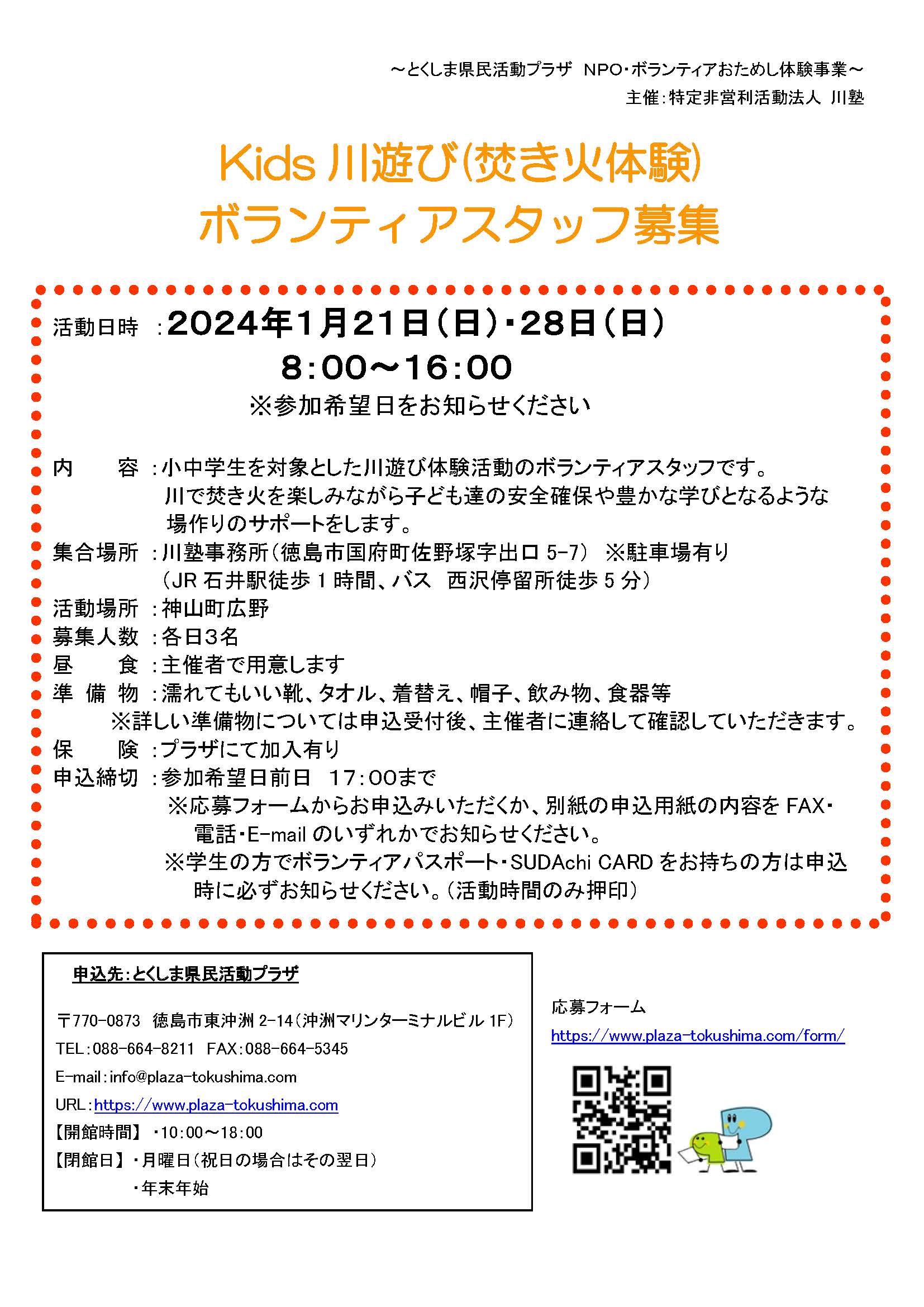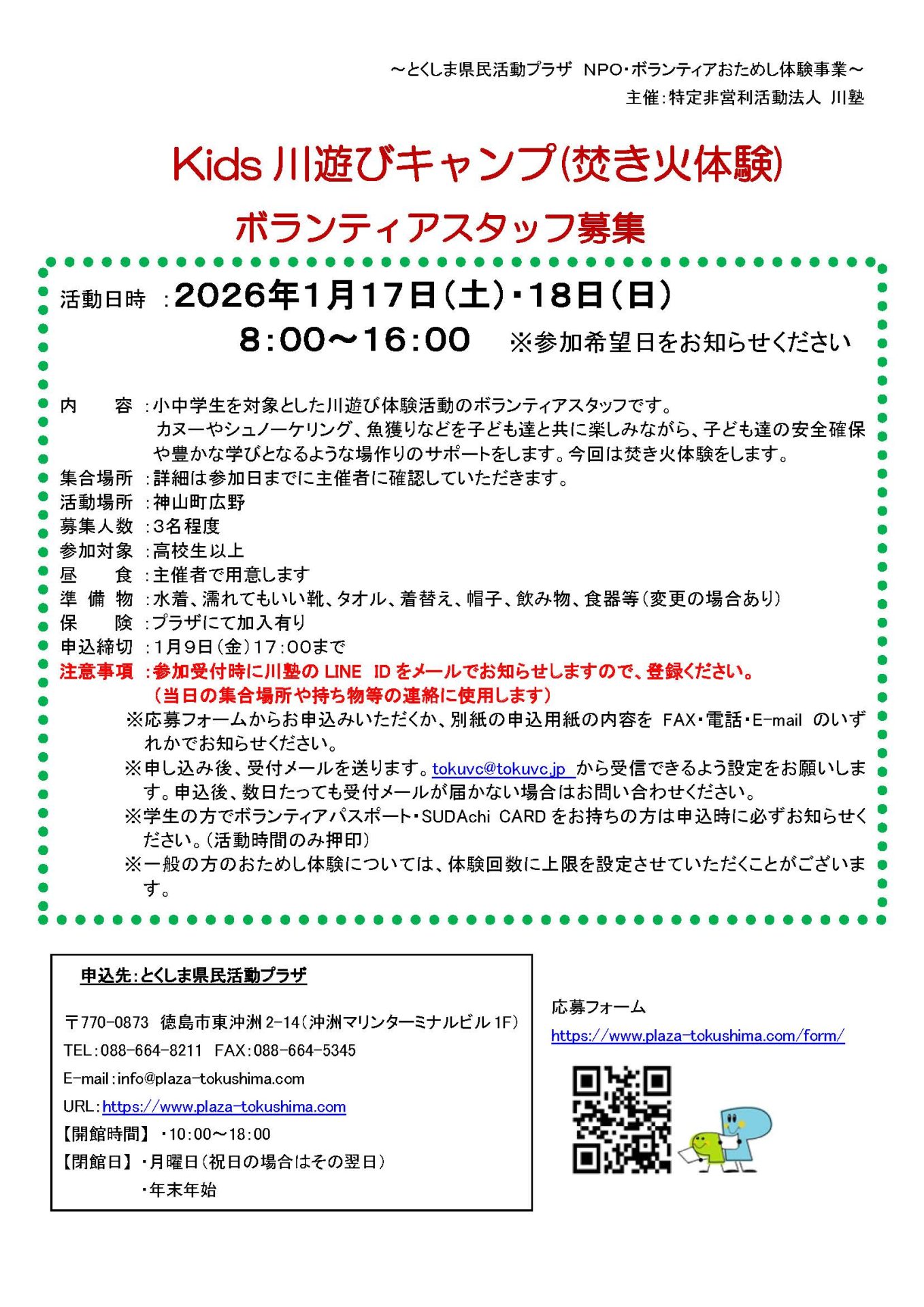 「Kids川遊びキャンプ(焚き火体験)」ボランティアスタッフ募集(2026年1月17日(土)・18日(日)) 2025年12月2日 お知らせ おためしボランティア情報 by plaza. こちらのフォームからお申し込みください。 ※必ずボランティアの名称を記入してください。 募集チラシ=Kids川遊び(焚き火体験) 前の記事 次の記事