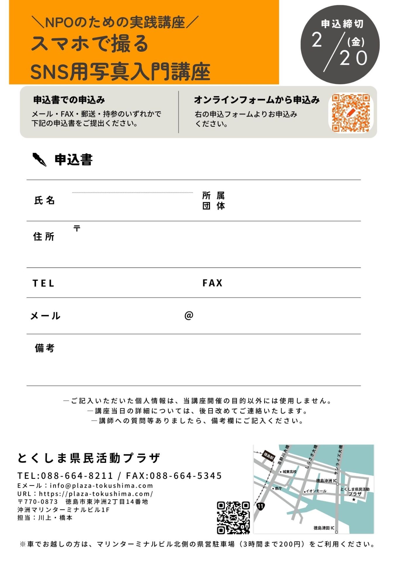 | 問い合わせ先 とくしま県民活動プラザ(10時~18時・月曜休館) 徳島市東沖洲二丁目14番地 沖洲マリンターミナルビル1F TEL:088-664-8211 FAX:088-664-5345 E-mail:info@plaza-tokushima.com |