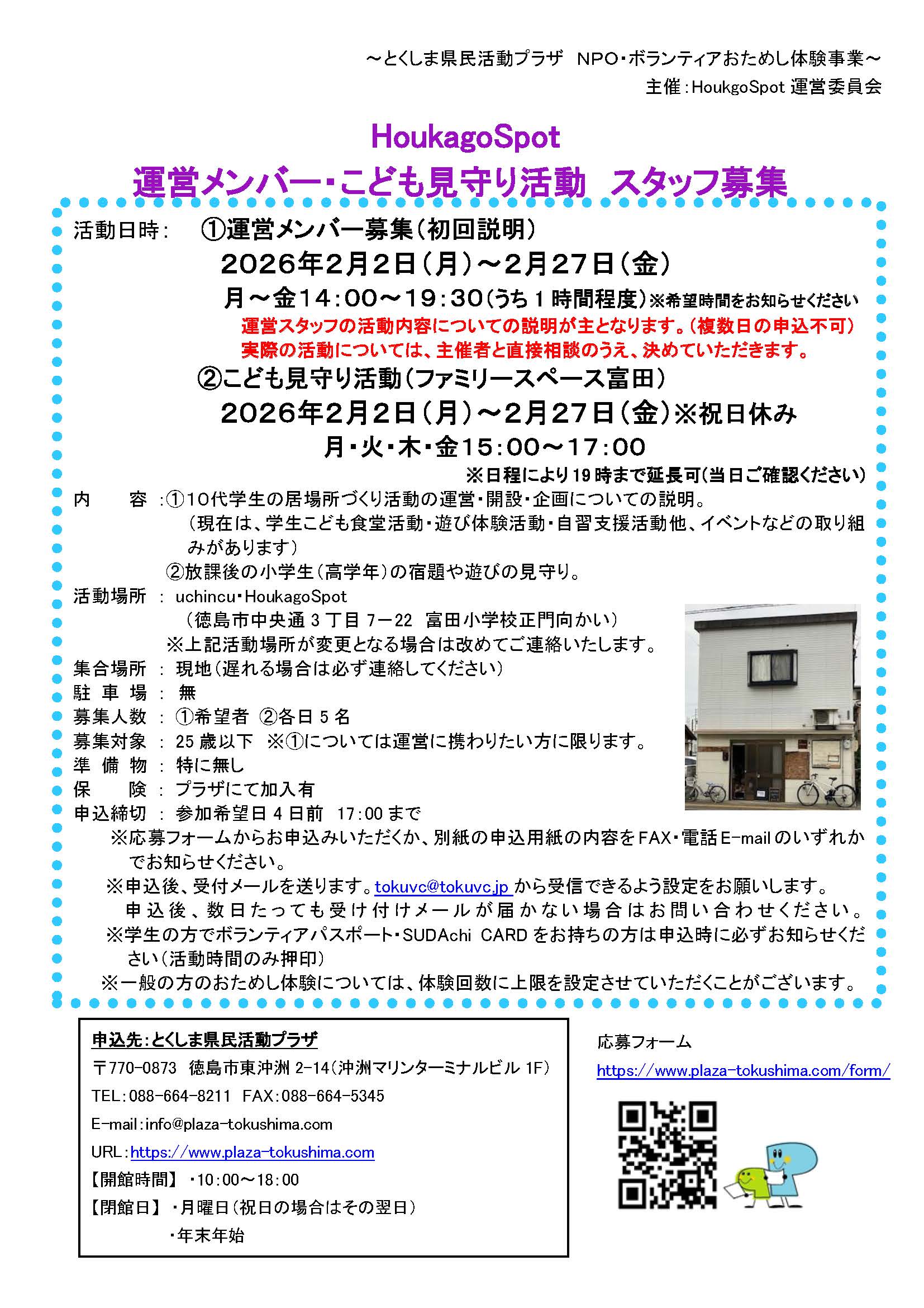 「HoukagoSpot運営メンバー・こども見守り活動)」ボランティアスタッフ募集(2026年2月)