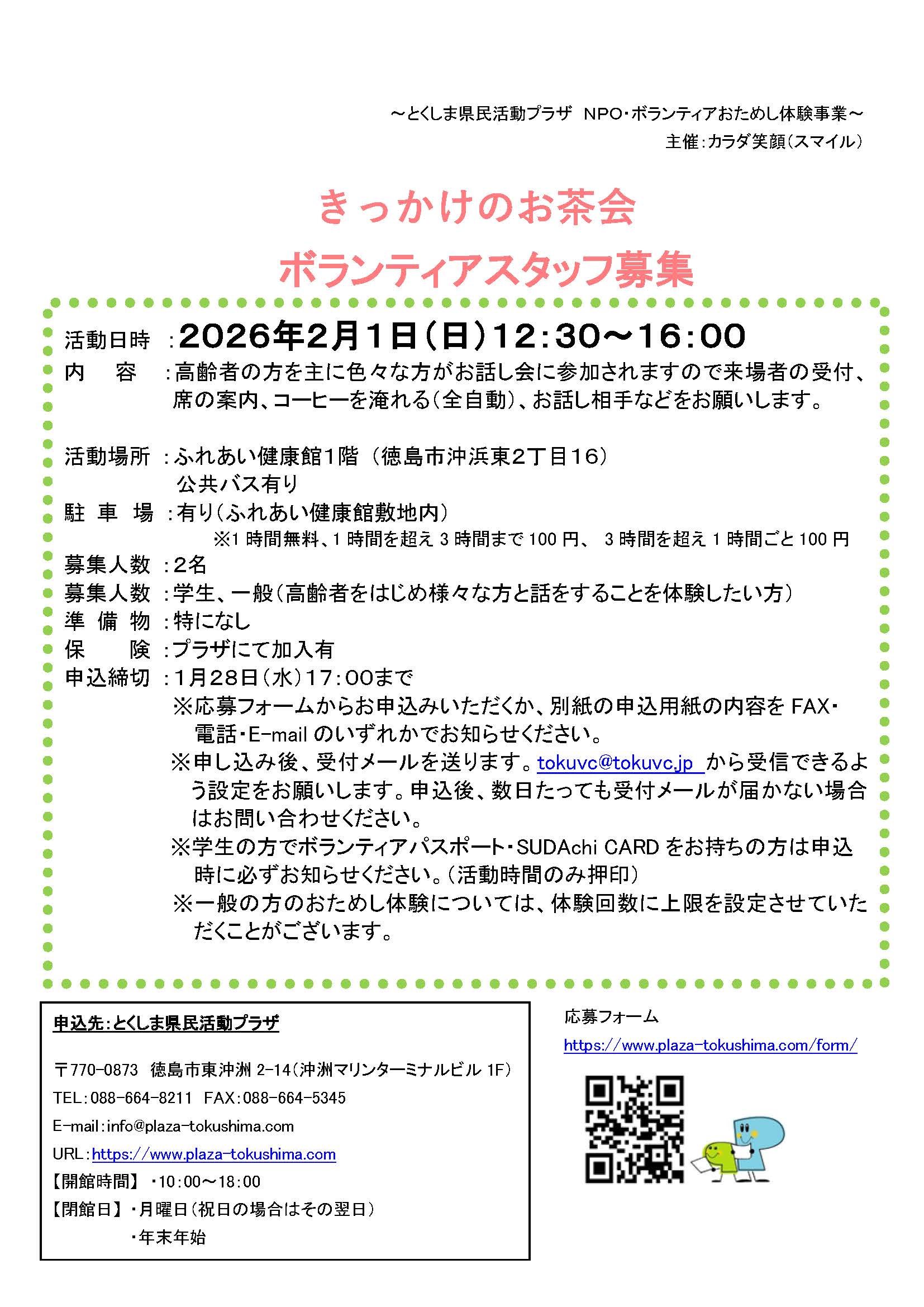 募集終了「きっかけのお茶会」ボランティアスタッフ募集(2026年2月1日(日)) 2026年1月16日 お知らせ おためしボランティア情報 by plaza. こちらのフォームからお申し込みください。 ※必ずボランティアの名称を記入してください。 募集チラシ=きっかけのお茶会 修正 前の記事 次の記事