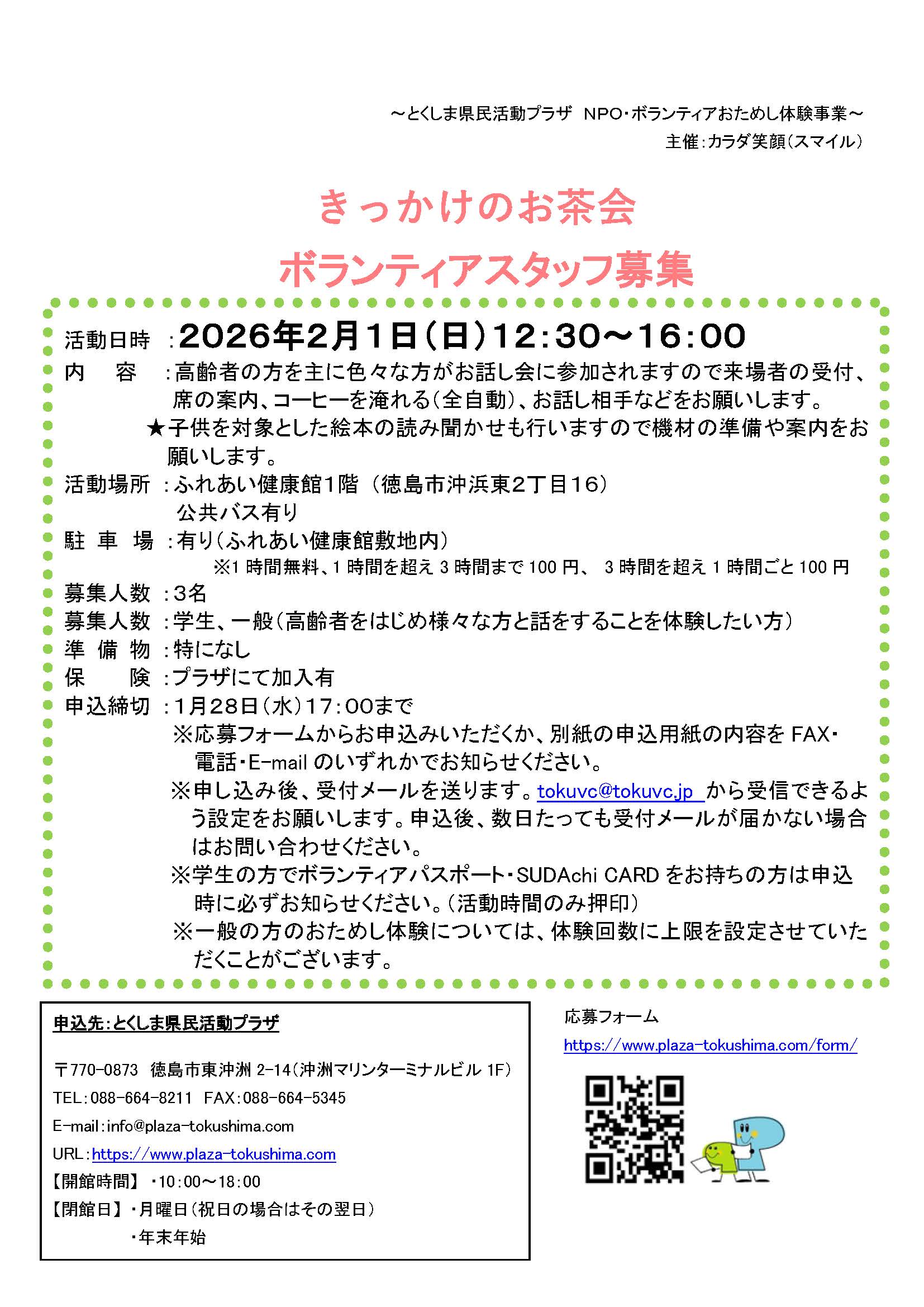 「きっかけのお茶会」ボランティアスタッフ募集(2026年2月1日(日)) 2026年1月4日 お知らせ おためしボランティア情報 by plaza. こちらのフォームからお申し込みください。 ※必ずボランティアの名称を記入してください。 募集チラシ=きっかけのお茶会 前の記事 次の記事