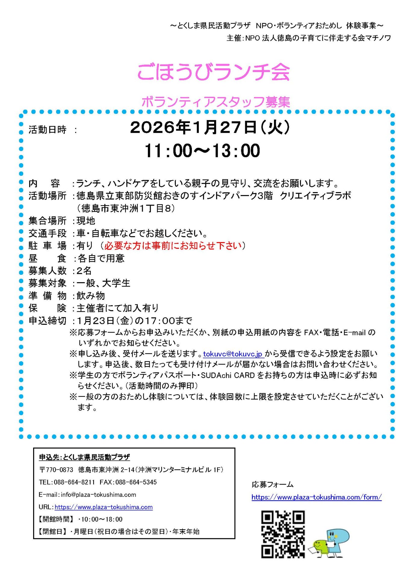 「ごほうびランチ会」ボランティアスタッフ募集(2026年1月27日(火)) 2026年1月10日 お知らせ おためしボランティア情報 by plaza. こちらのフォームからお申し込みください。 ※必ずボランティアの名称を記入してください。 募集チラシ=ごほうびランチ会 修正 前の記事