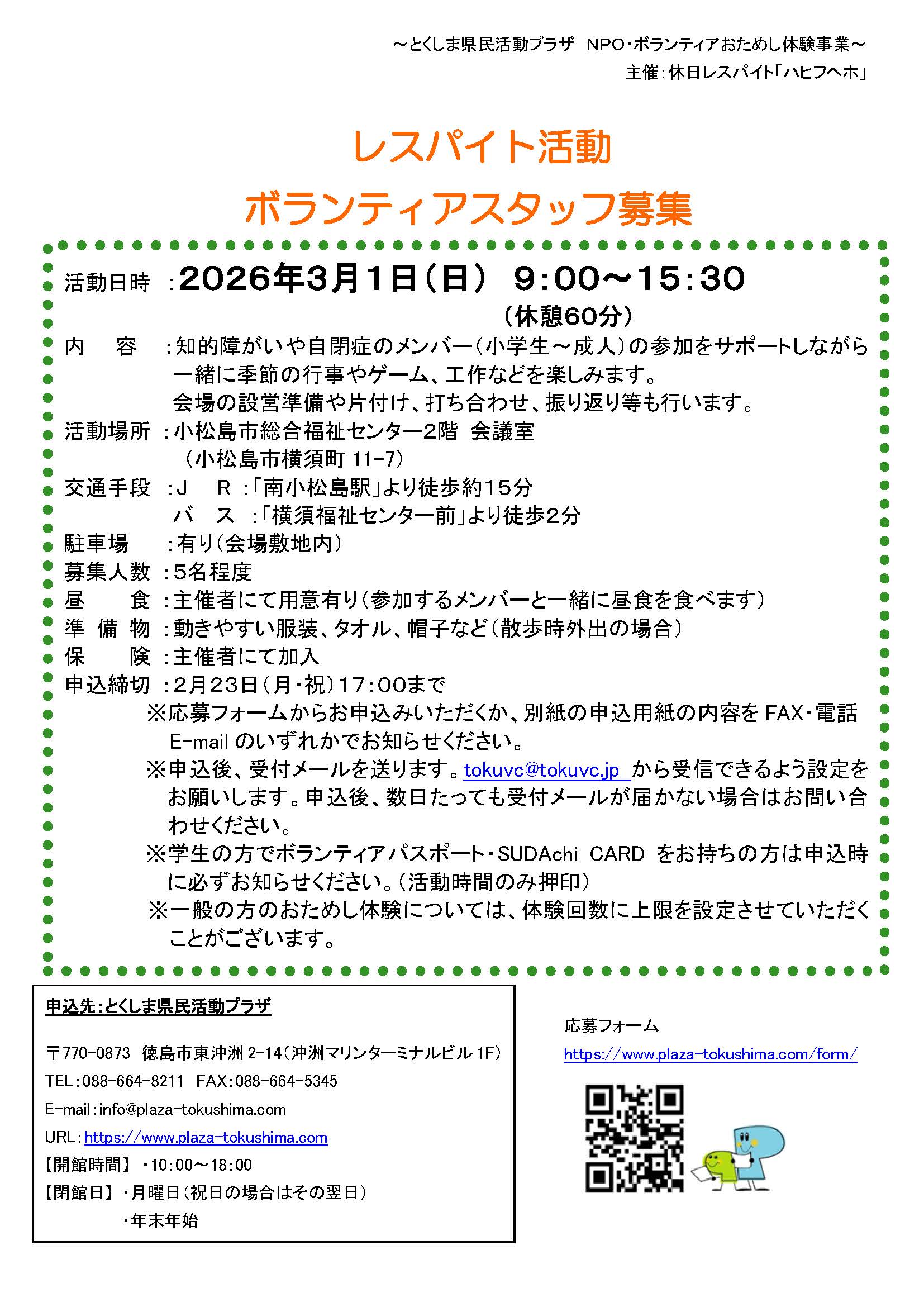 「レスパイト活動」ボランティアスタッフ募集(2026年3月1日(日)) 2026年2月1日 お知らせ おためしボランティア情報 by plaza. こちらのフォームからお申し込みください。 ※必ずボランティアの名称を記入してください 募集チラシレスパイト活動 前の記事 次の記事