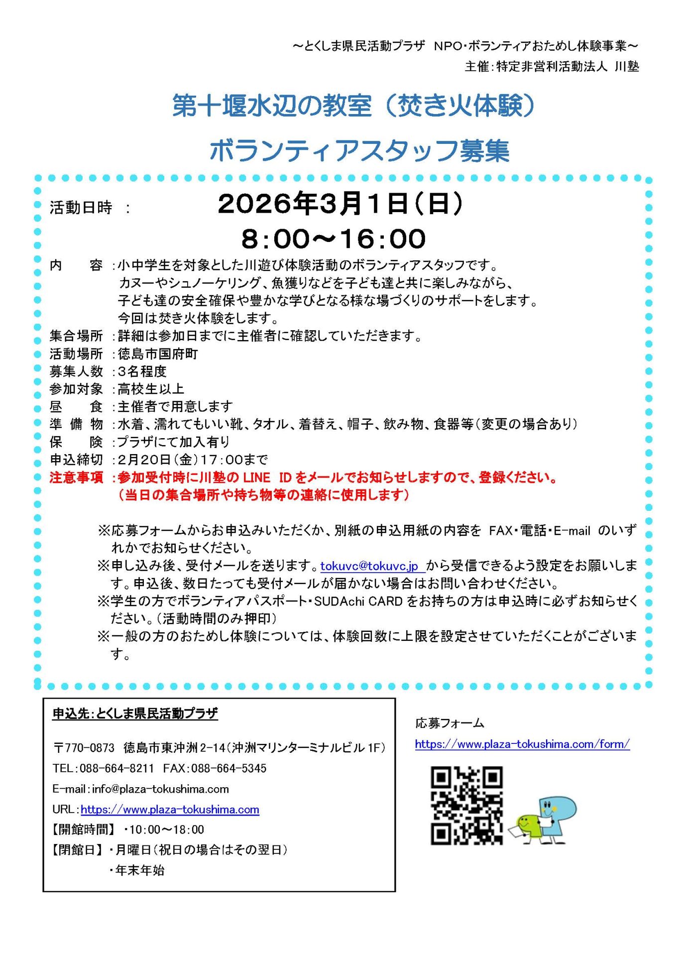 「第十堰水辺の教室(焚き火体験)」ボランティアスタッフ募集(2026年3月1日(日)) 2026年2月1日 お知らせ おためしボランティア情報 by plaza. こちらのフォームからお申し込みください。 ※必ずボランティアの名称を記入してください。 募集チラシ=第十堰水辺の教室(焚き火体験) 前の記事 次の記事