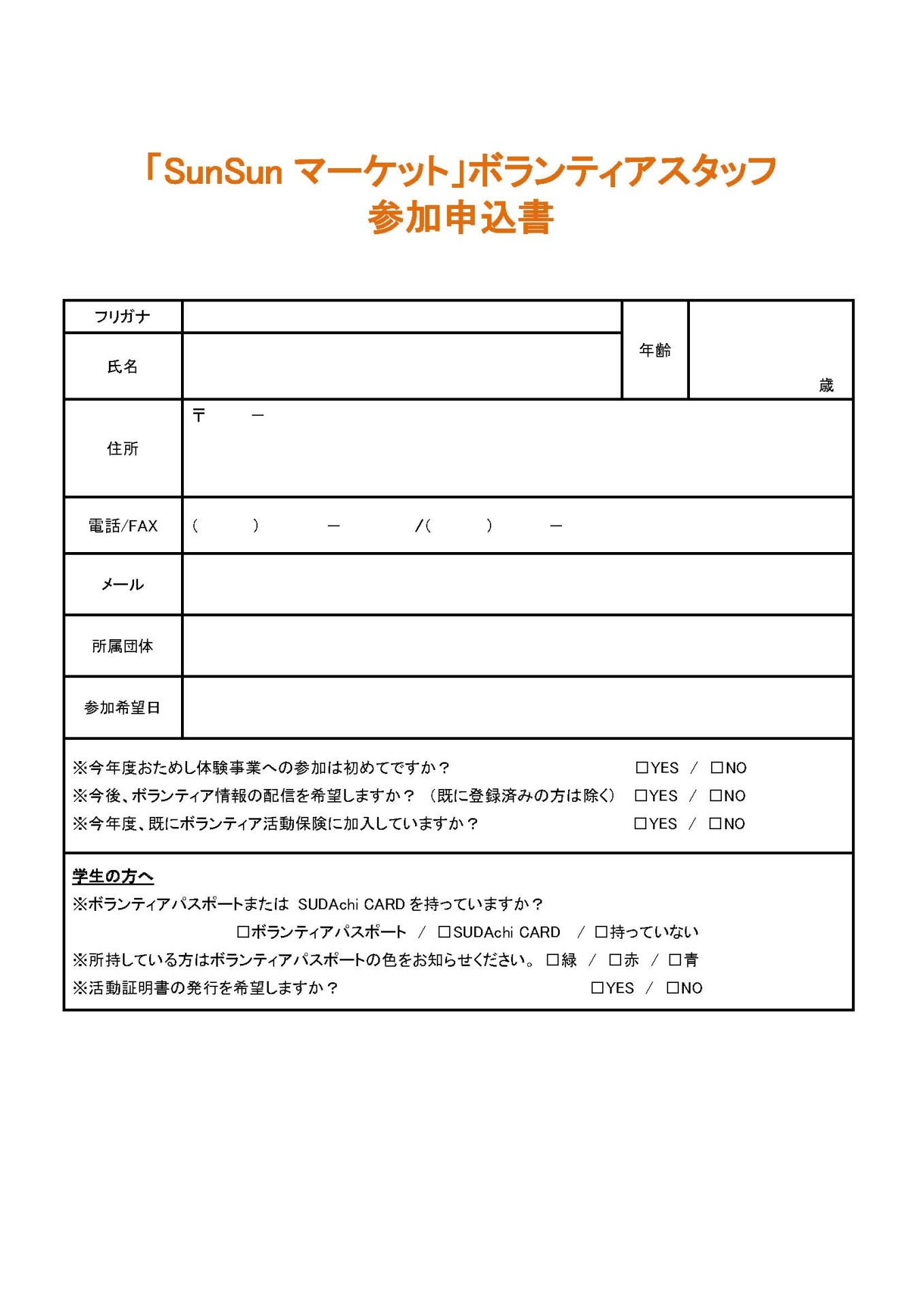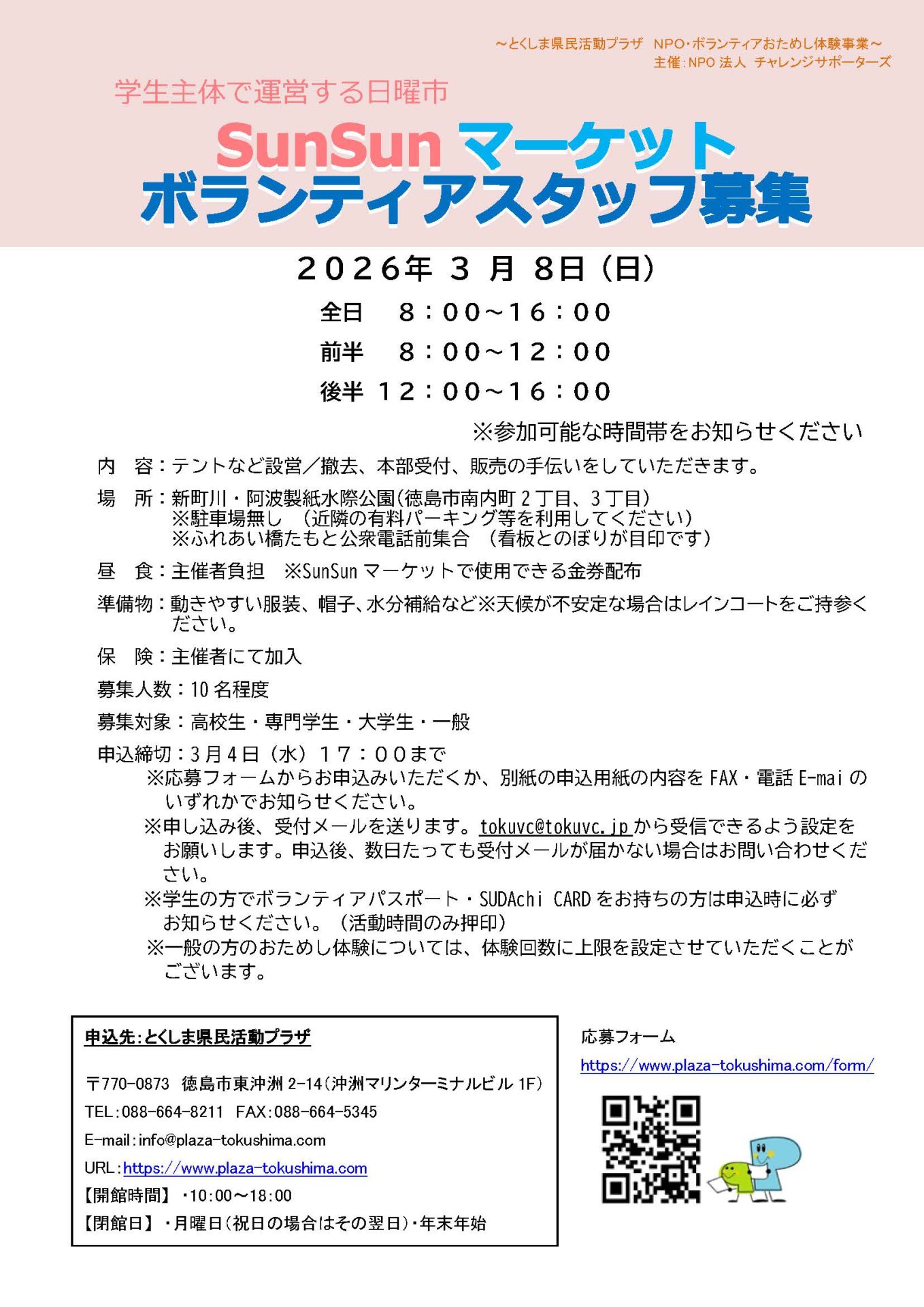 「SunSunマーケット」ボランティアスタッフ募集(2026年3月8日(日)) 2026年2月1日 お知らせ おためしボランティア情報 by plaza. こちらのフォームからお申し込みください。 ※必ずボランティアの名称を記入してください。 募集チラシ=SunSunマーケット 前の記事 次の記事