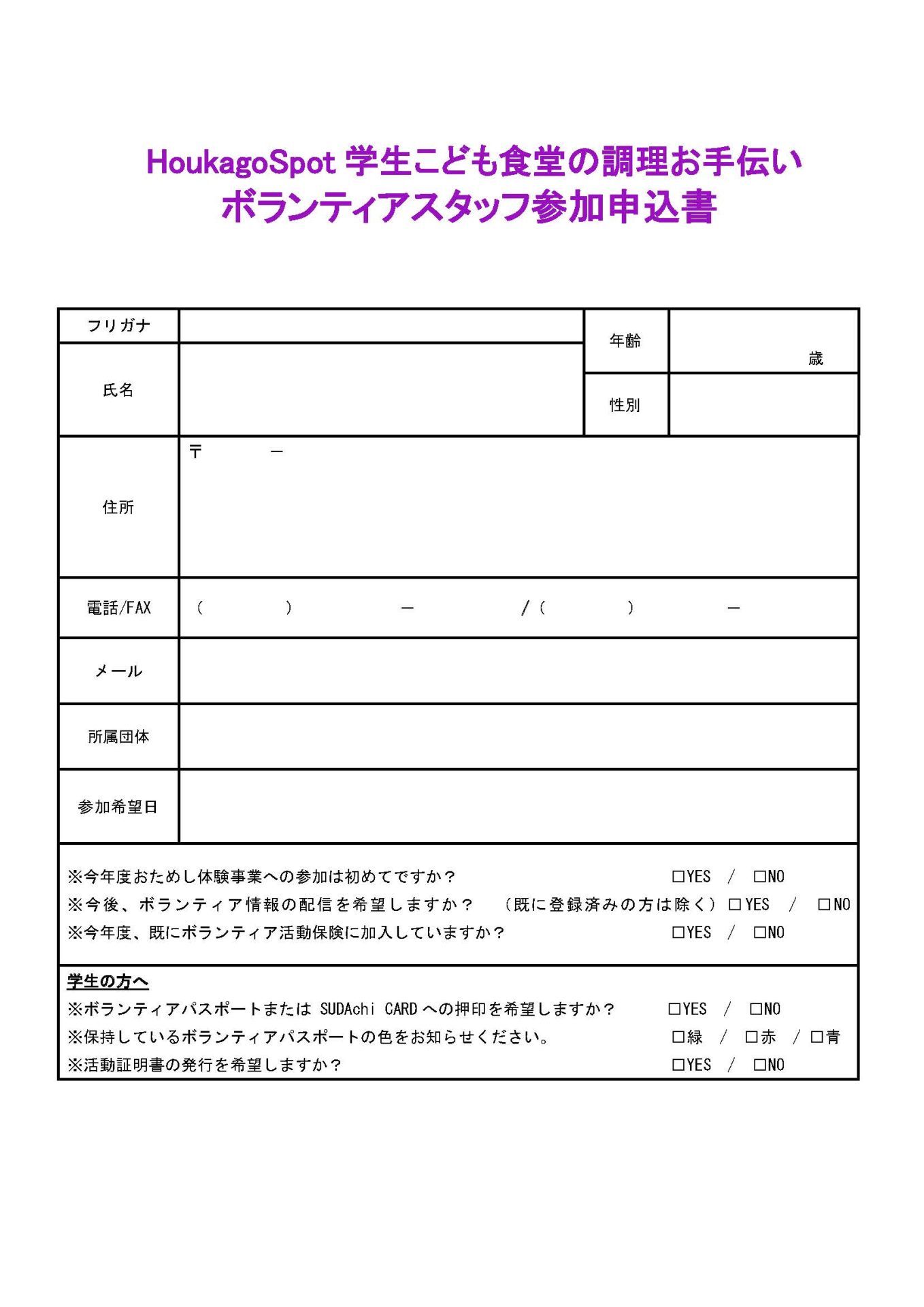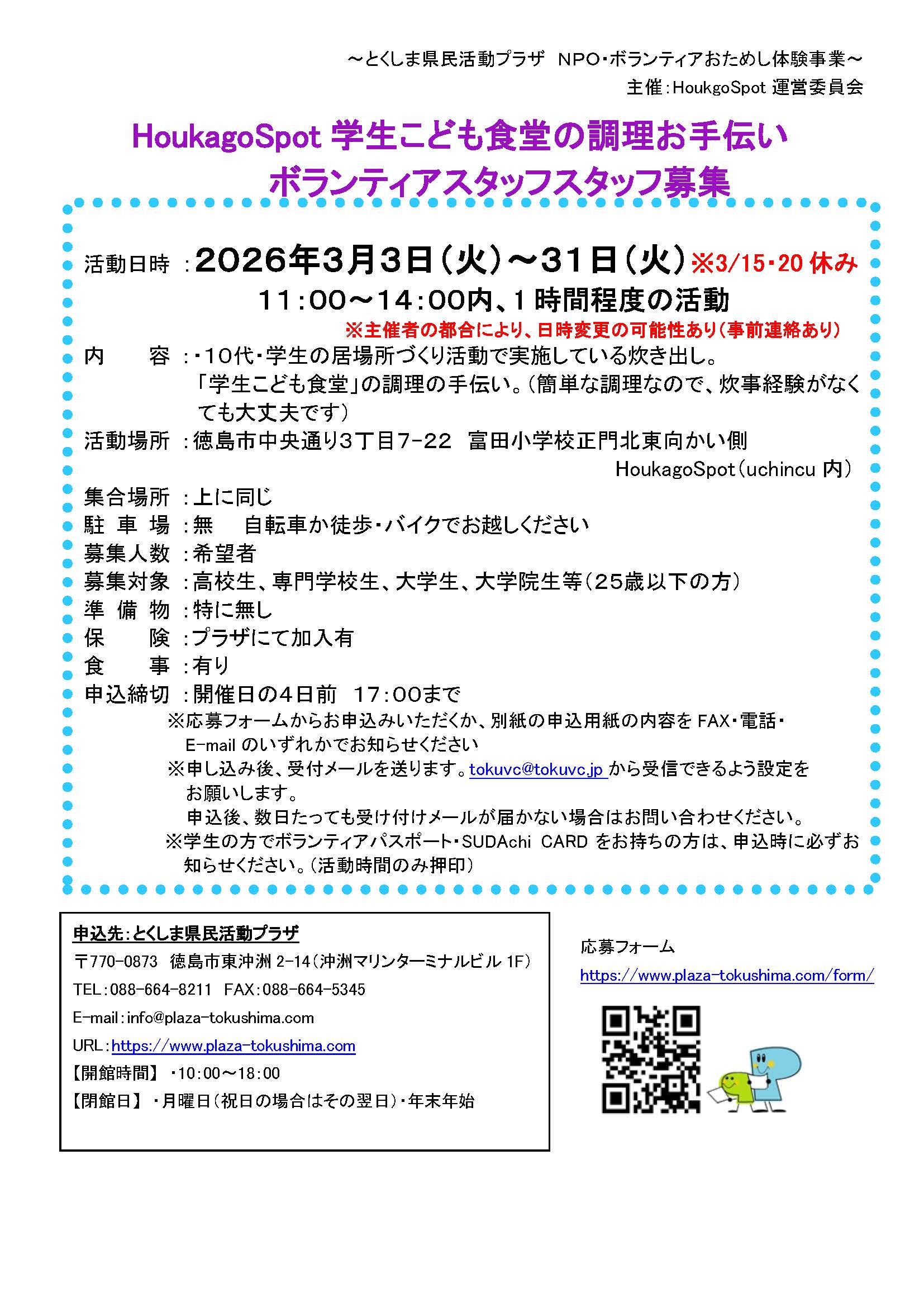 「HoukagoSpot学生こども食堂の調理お手伝い」ボランティアスタッフ募集 2026年2月18日 お知らせ おためしボランティア情報 by plaza. こちらのフォームからお申し込みください。 ※必ずボランティアの名称を記入してください。 チラシHoukgoSpot学生こども食堂の調理お手伝い 前の記事