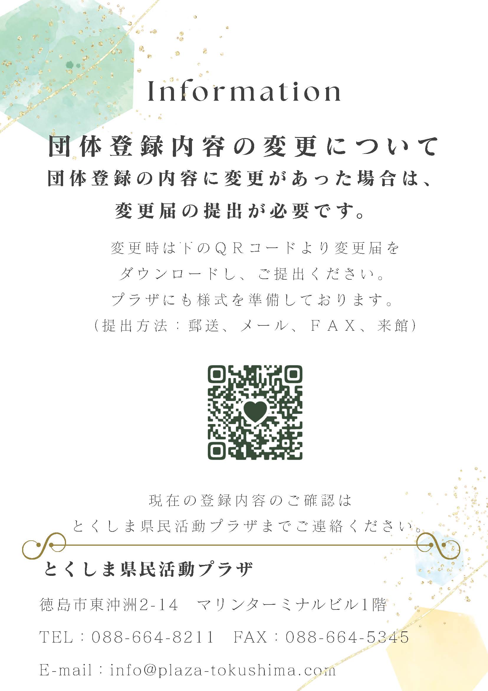団体登録の内容に変更があれば、プラザに変更届をご提出ください。