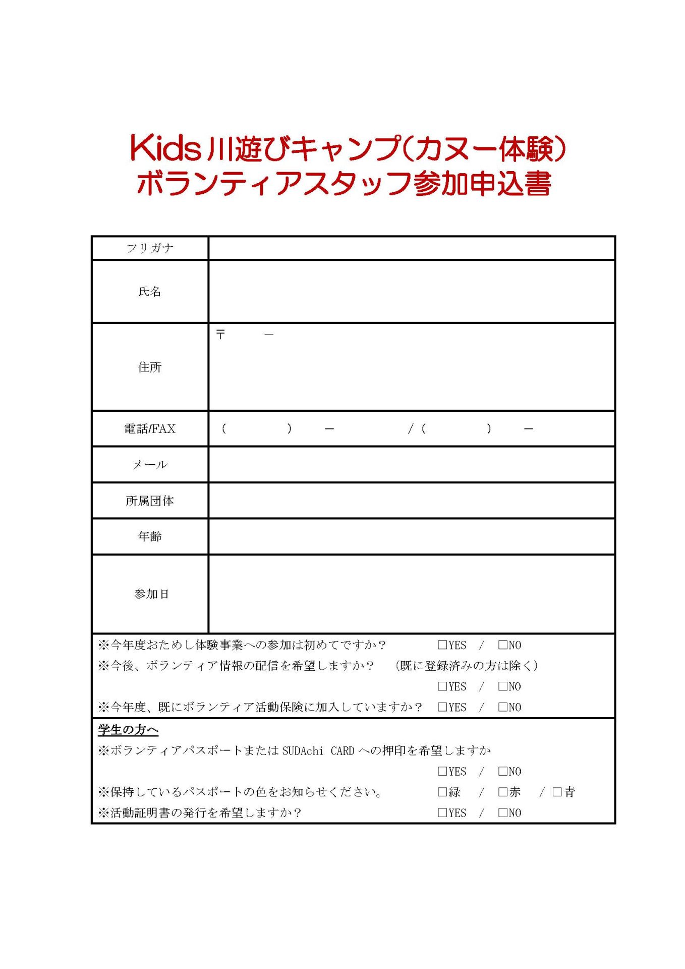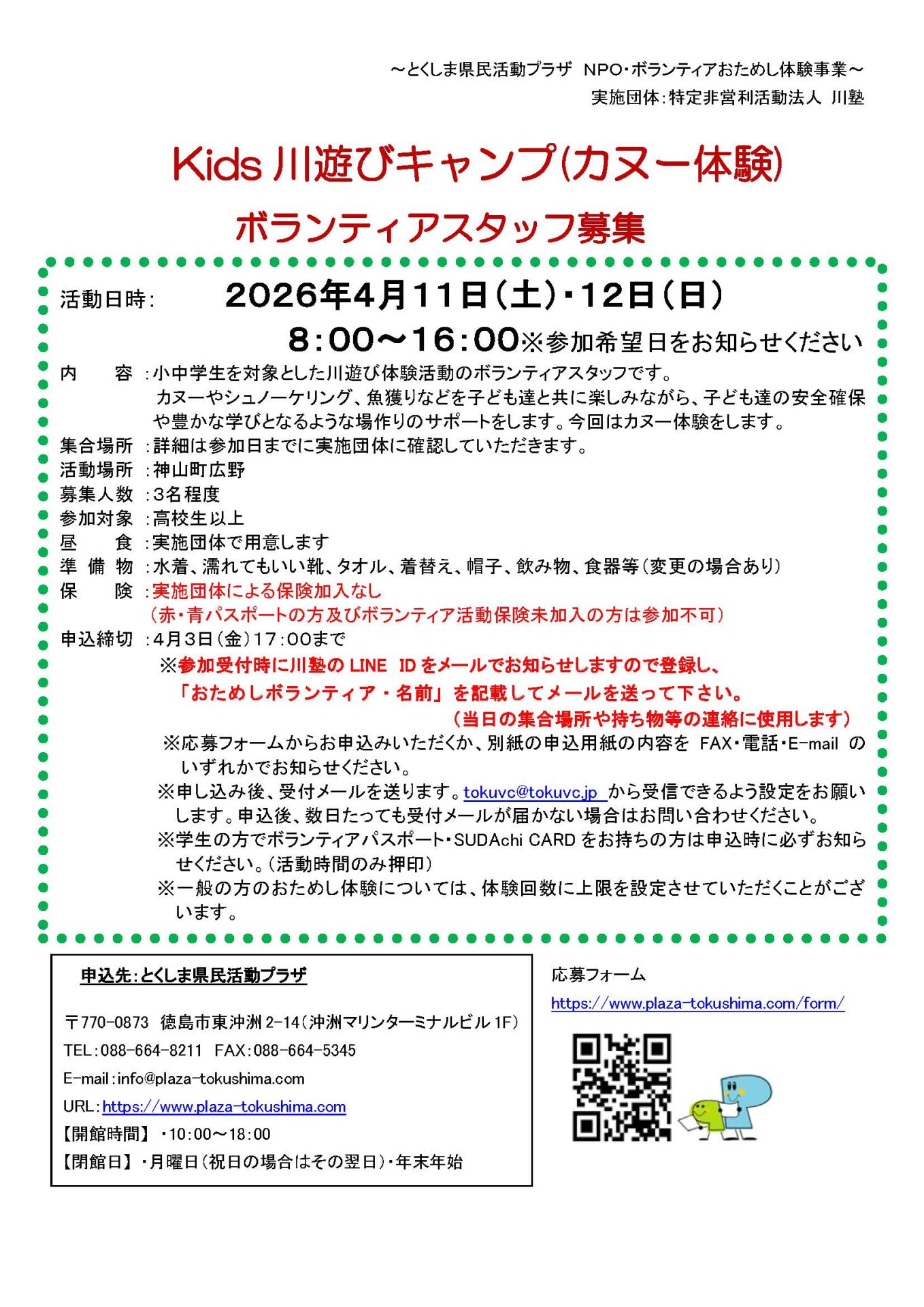 「Kids川遊びキャンプ(カヌー体験)」ボランティアスタッフ募集(2026年4月11日(土)・12日(日)) 2026年3月18日 お知らせ おためしボランティア情報 by plaza. こちらのフォームからお申し込みください。 ※必ずボランティアの名称を記入してください。 募集チラシ=Kids川遊び(カヌー体験) 前の記事 次の記事