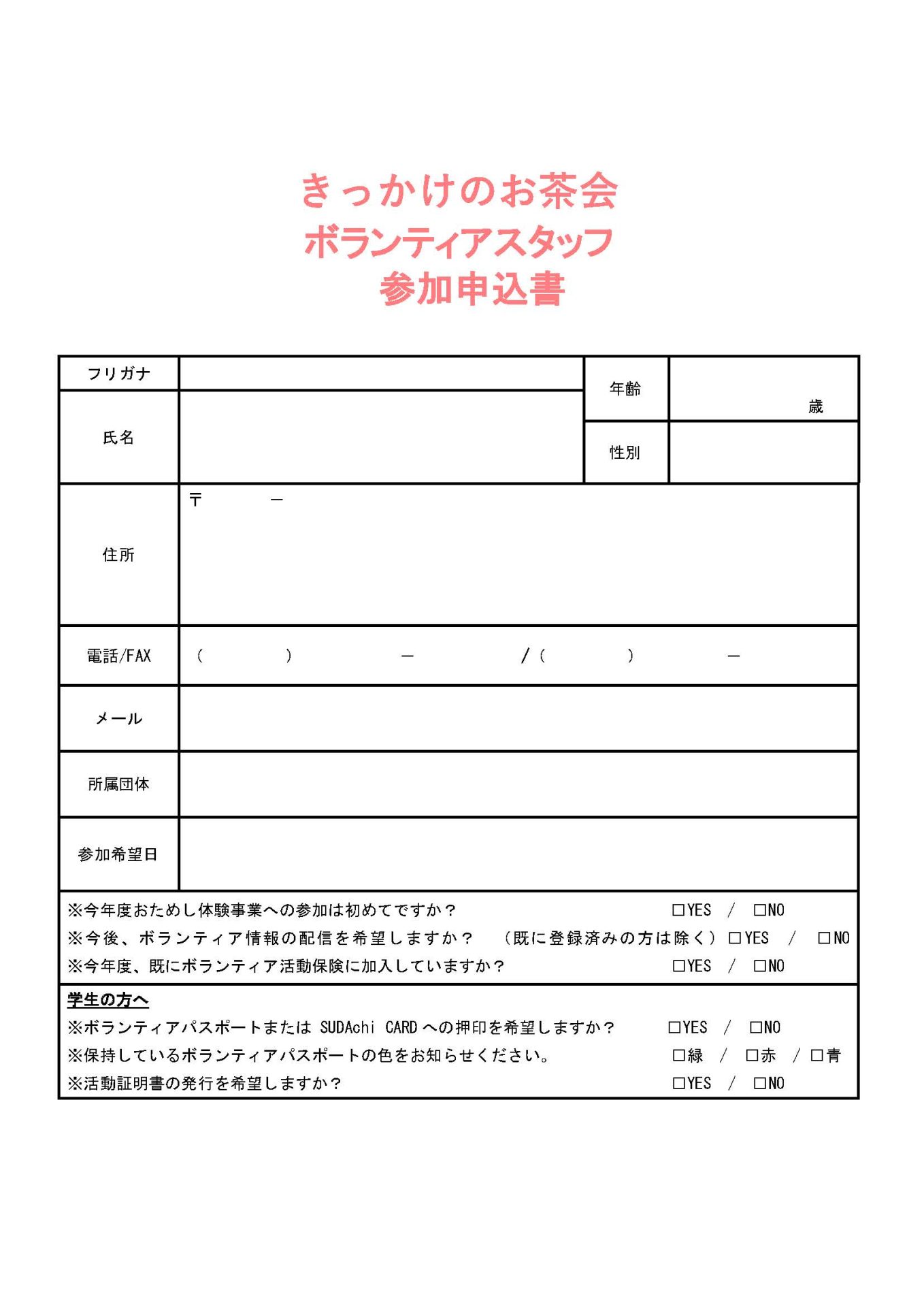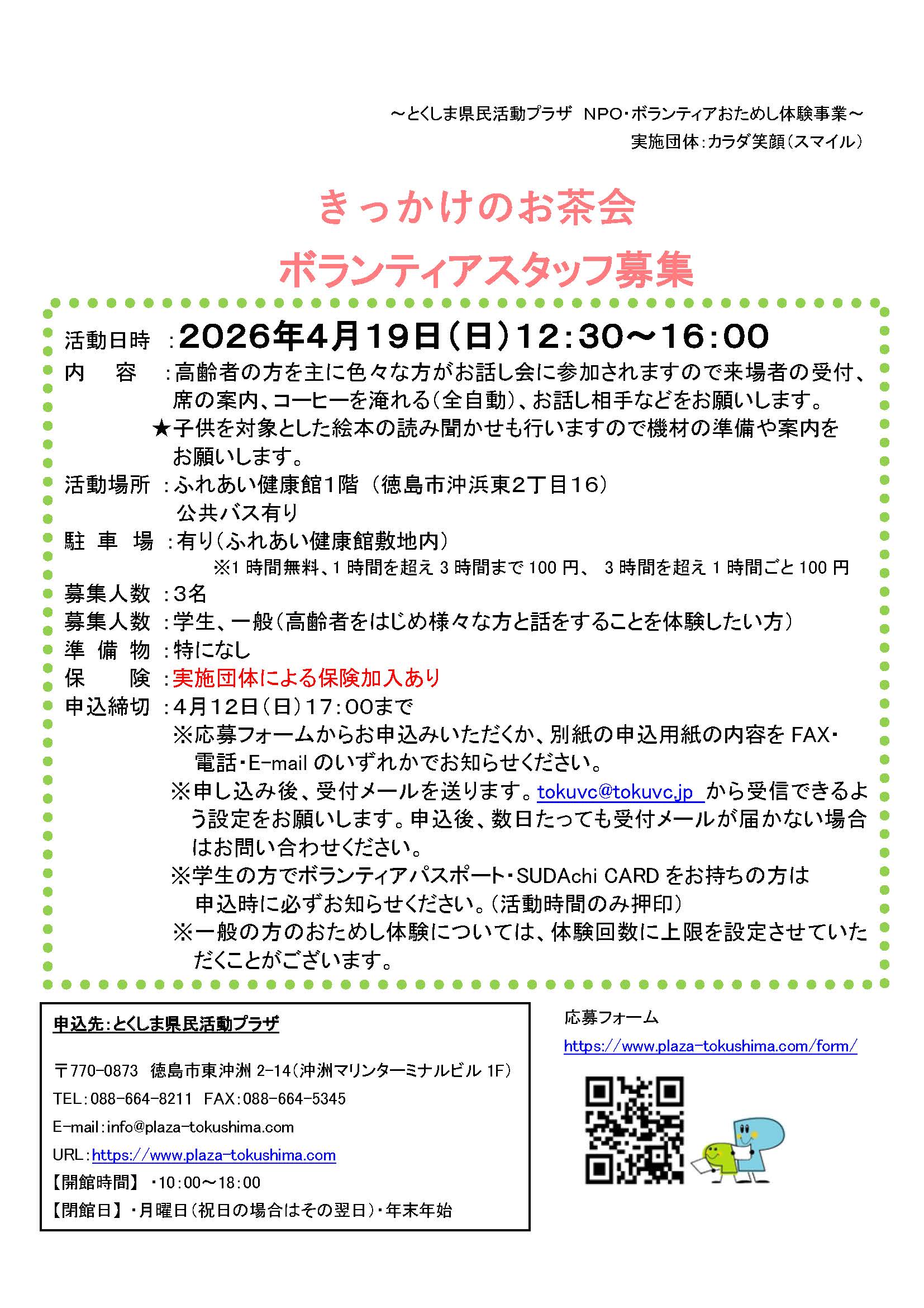 「きっかけのお茶会」ボランティアスタッフ募集(2026年4月19日(日)) 2026年3月18日 お知らせ おためしボランティア情報 by plaza. こちらのフォームからお申し込みください。 ※必ずボランティアの名称を記入してください。 募集チラシ=きっかけのお茶会 前の記事 次の記事