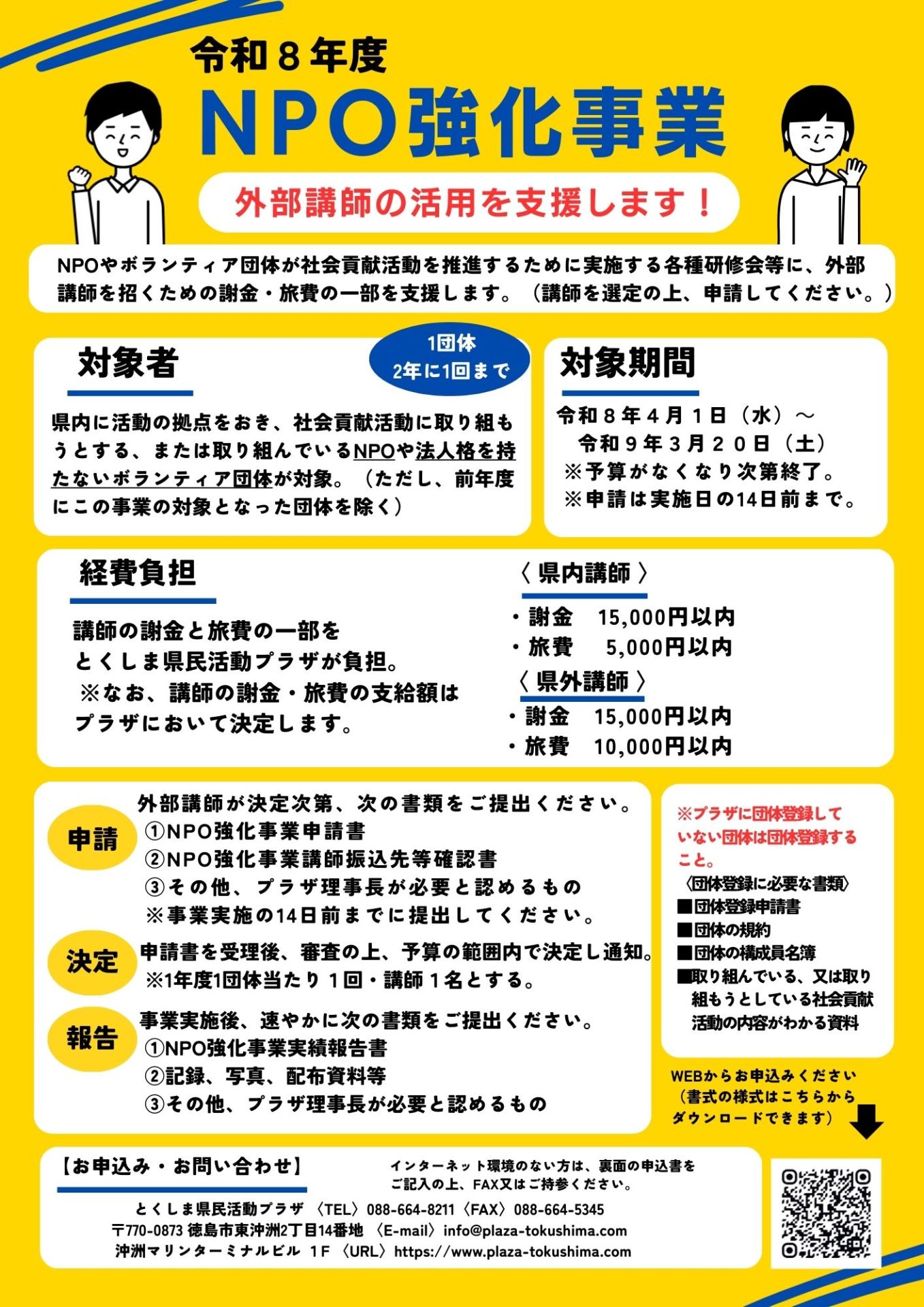 NPO強化事業の謝金と旅費の一部をとくしま県民活動プラザが負担いたします。 ※なお、講師の謝金・旅費の支給額はプラザにおいて決定します。