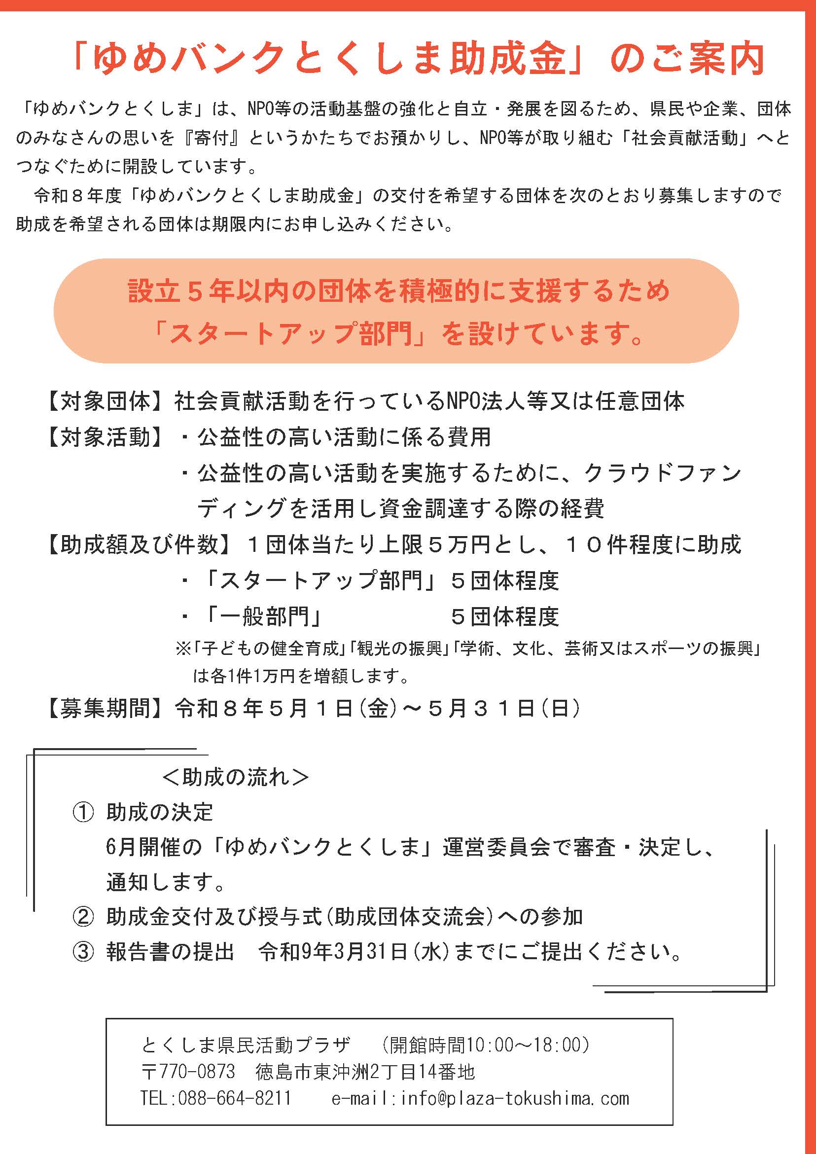 令和8年度「ゆめバンクとくしま助成金」のご案内 2026年3月18日 お知らせ プラザ事業 助成情報 by plaza. 「とくしま県民活動プラザ」では、NPO等の活動基盤の強化と自立・発展を図るため、県民や企業、団体のみなさんの思いを『寄付』というかたちでお預かりし、NPO等が取り組む「社会貢献活動」へとつなぐために、「ゆめバンクとくしま」を開設しています。 令和8年度「ゆめバンクとくしま助成活動」を募集しますので、助成を希望される団体は期限内にお申し込みください。 ●募集期間:令和8年5月1日(金)~5月31日(日) ●お問い合わせ先 とくしま県民活動プラザ 電話:088-664-8211 前の記事