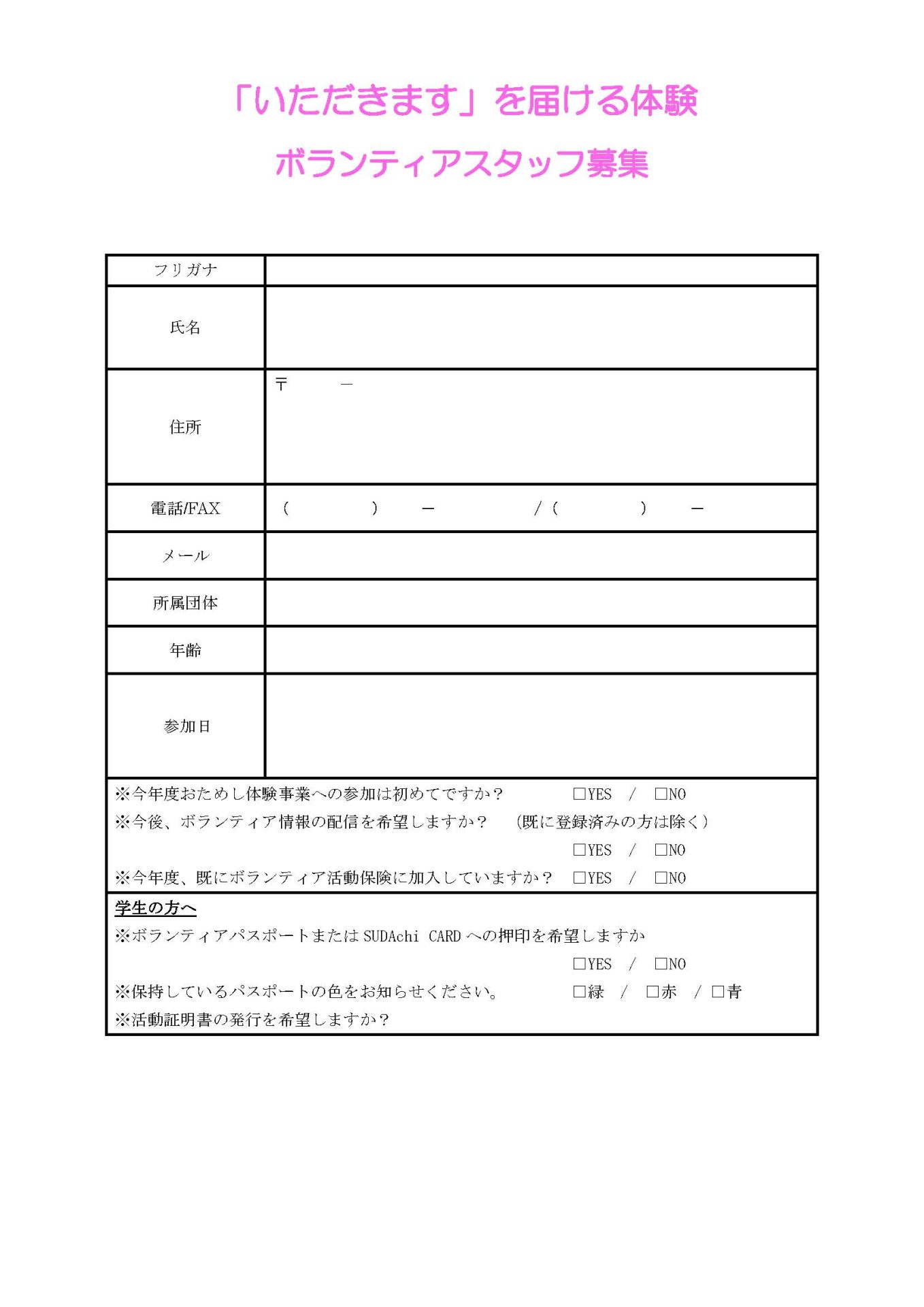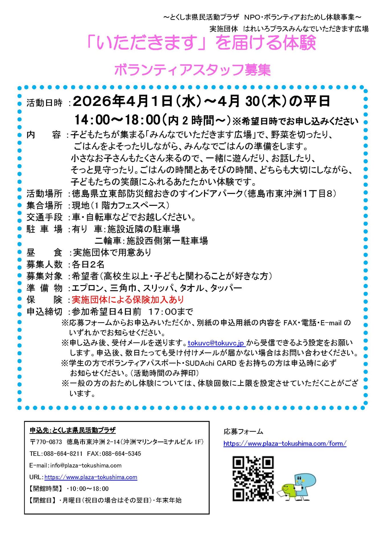 【「いただきます」を届ける体験】ボランティアスタッフ募集(4月) 2026年3月20日 お知らせ おためしボランティア情報 by plaza. こちらのフォームからお申し込みください。 ※必ずボランティアの名称を記入してください。 チラシはれいろプラスみんなでいただきます広場 前の記事 次の記事