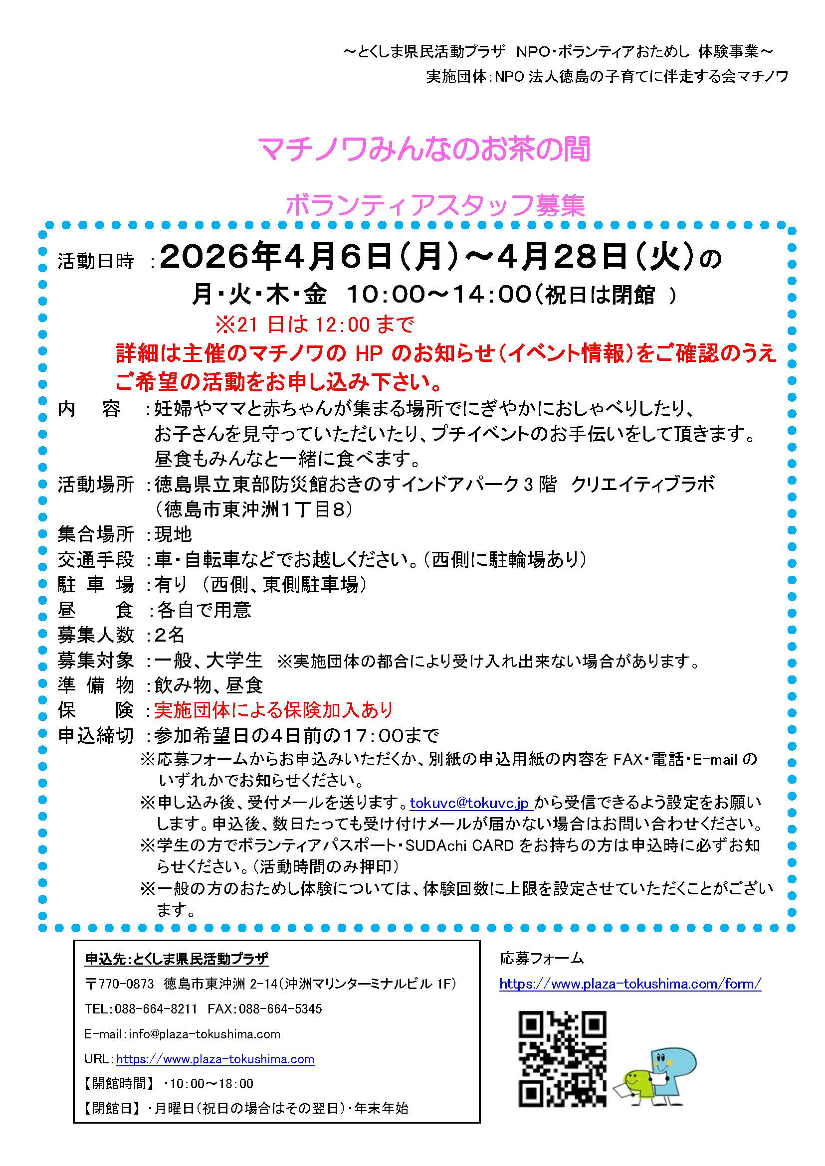 「マチノワみんなのお茶の間 ボランティアスタッフ募集(2026年4月) 2026年3月20日 お知らせ おためしボランティア情報 by plaza. こちらのフォームからお申し込みください。 ※必ずボランティアの名称を記入してください。 募集チラシ=マチノワみんなのお茶の間 前の記事